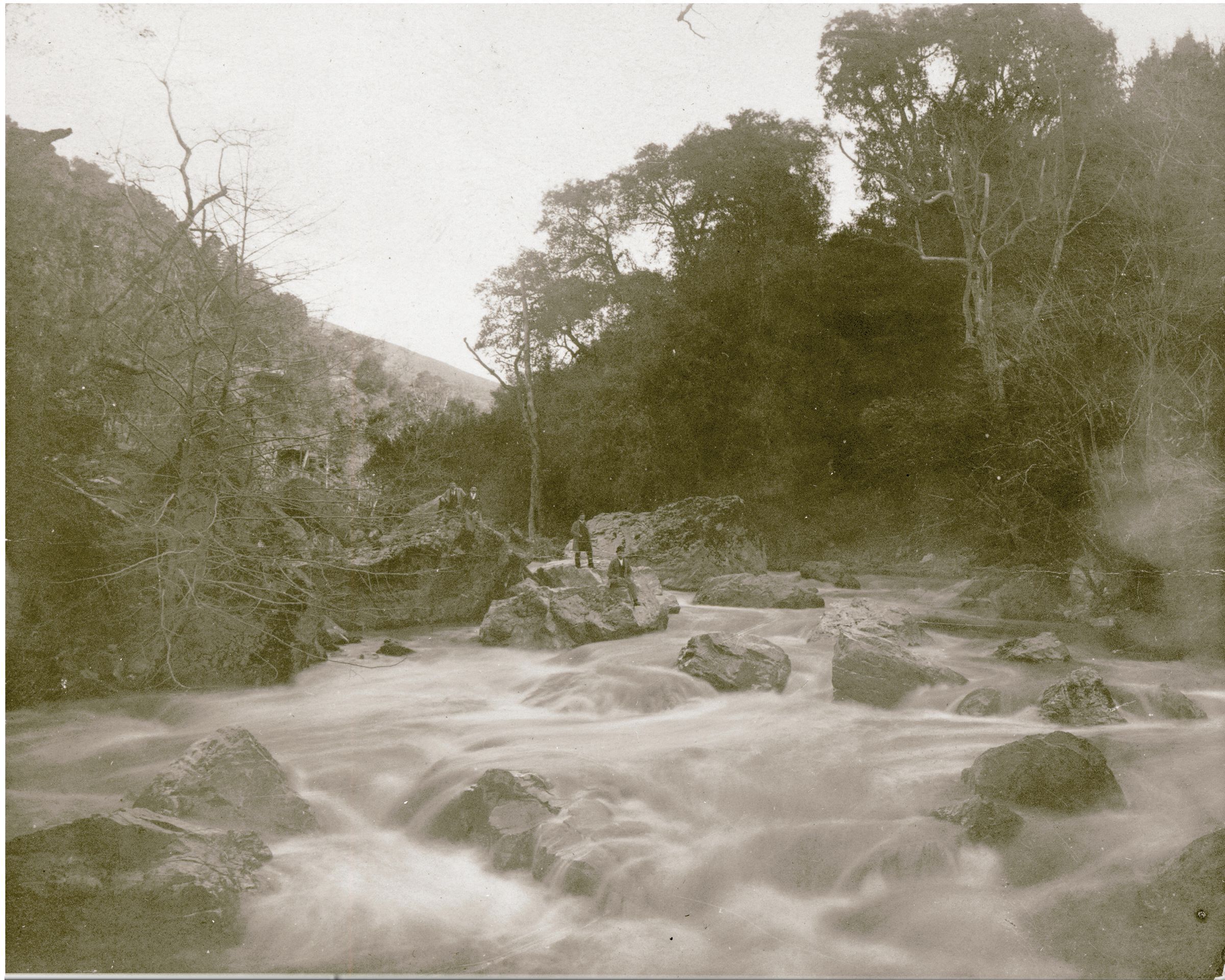 This photograph was taken in 1899, when Los Gatos Creek was still a nearly year-round stream. Before the waters were dammed, locals walked to the northerly running through-town creek almost any month of the year to catch speckled trout for dinner. The men on the rocks are holding pistols. LGC001Collection