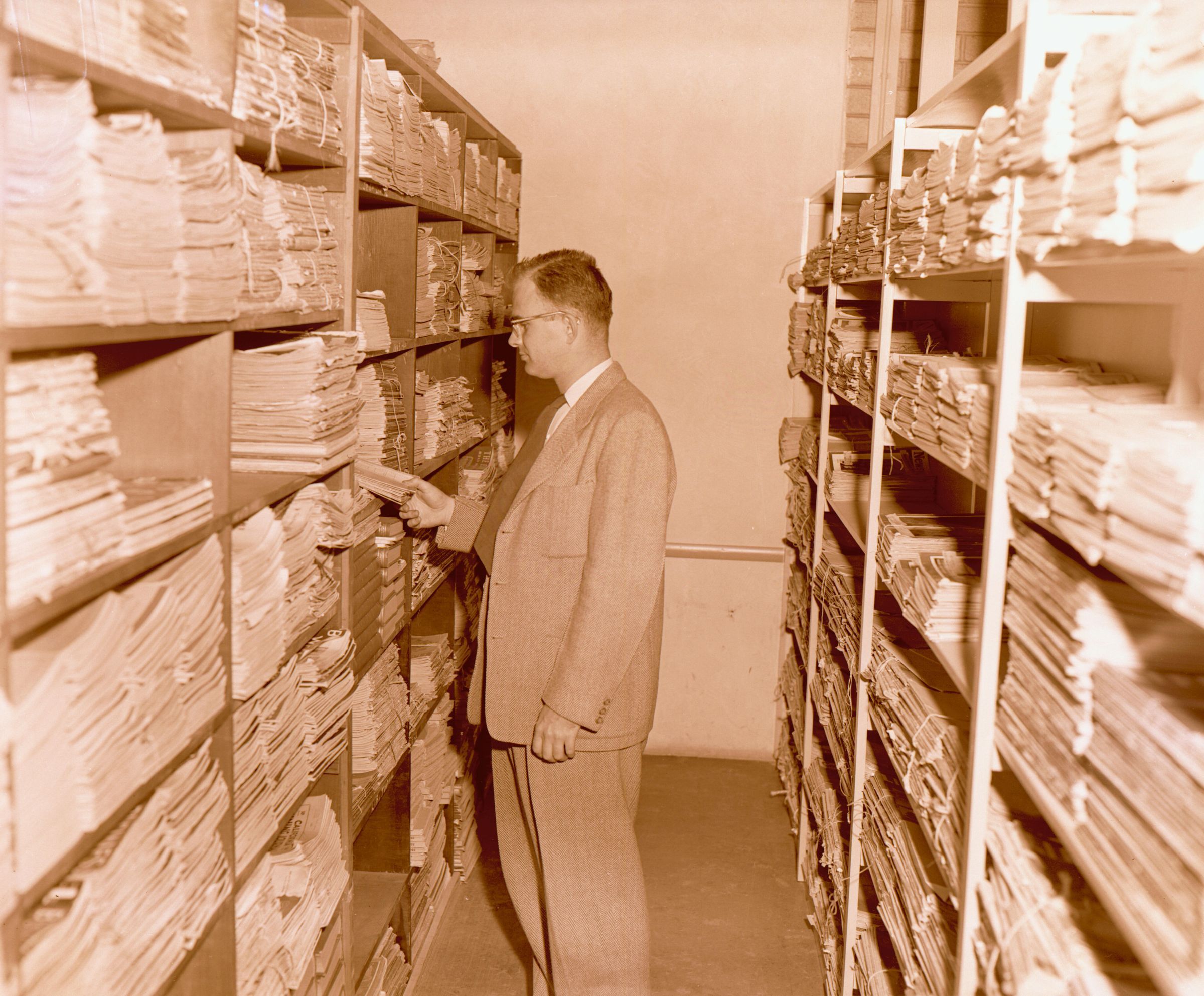 Librarian John Schmuck checks back-issues of newspapers archived in the library. LGL007Collection