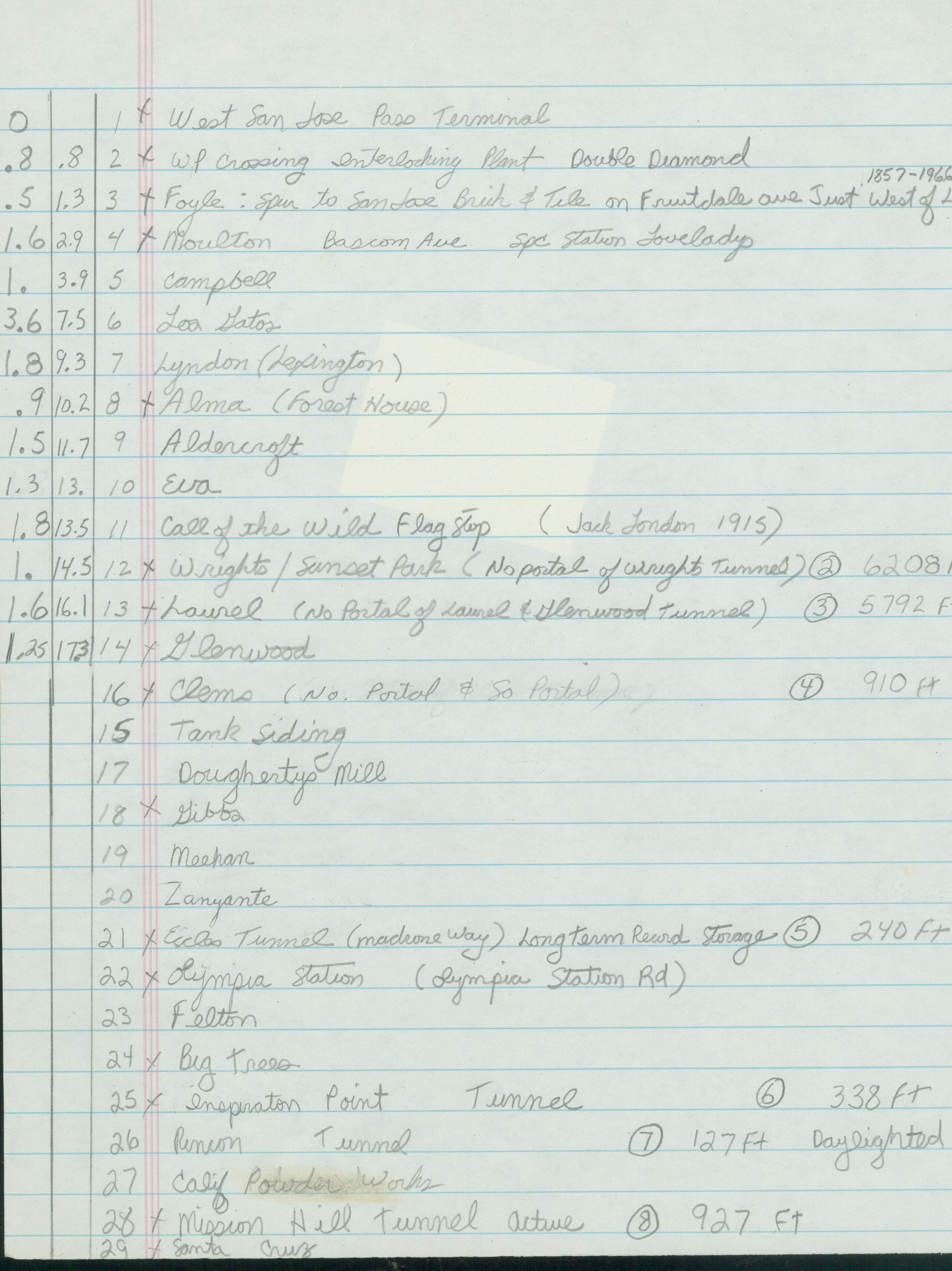 This document consists of the donor's handwritten notes listing rail mileage between various stops and landmarks along the South Pacific Cast Right of way begining at the "West San Jose Terminal". Point-to-point milage is show for: San Jose to Foyle to Fruitdale Avenueto Bascom Avenue to Moulton to Campbell to Los Gatos to Alma to Aldercroft Heights to Eva to Call of the Wild, (i.e.Jack London) to Wrights to Sunset Park to Laure and to Glenwood. LEI008Collection