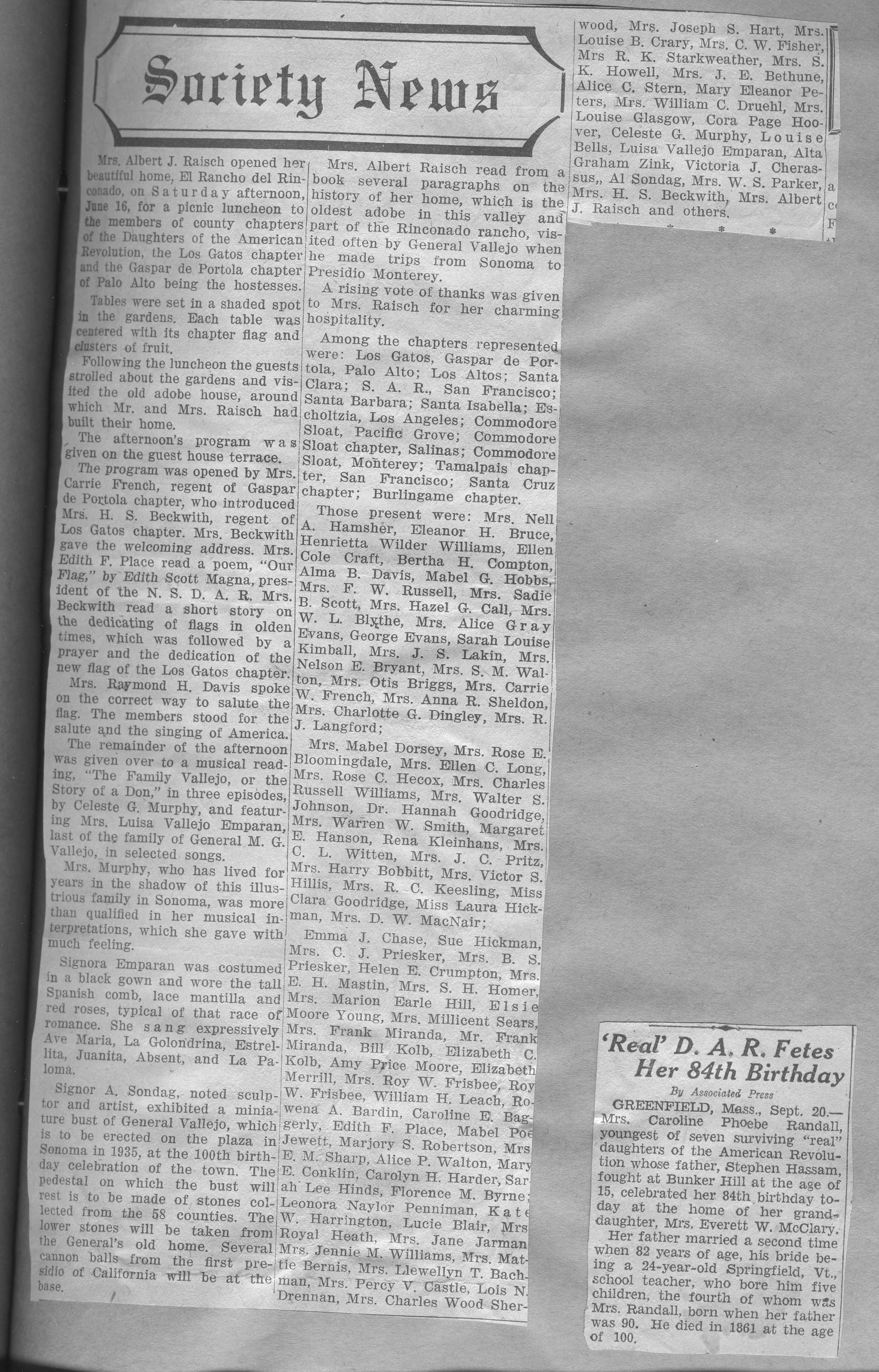 Mrs. Albert J. Raisch hosted a luncheon meeting for members of a number of local D.A.R. chapters at her home, the Simond Adobe, the third house on Rancho Rinconada de los Gatos. The program included a story about the flag and the correct way to honor it, and a musical reading about the Vallejo family, composed by Celeste Murphy of Sonoma and sung by Luisa Vallejo Emparan, the last of that family. There was also a viewing of a miniature bust of General Vallejo that will be erected in the Sonoma plaza in 1935. An extensive list of the guests is included. There is a short article about a Daughter whose father had fought at Bunker Hill. DAR008Collection