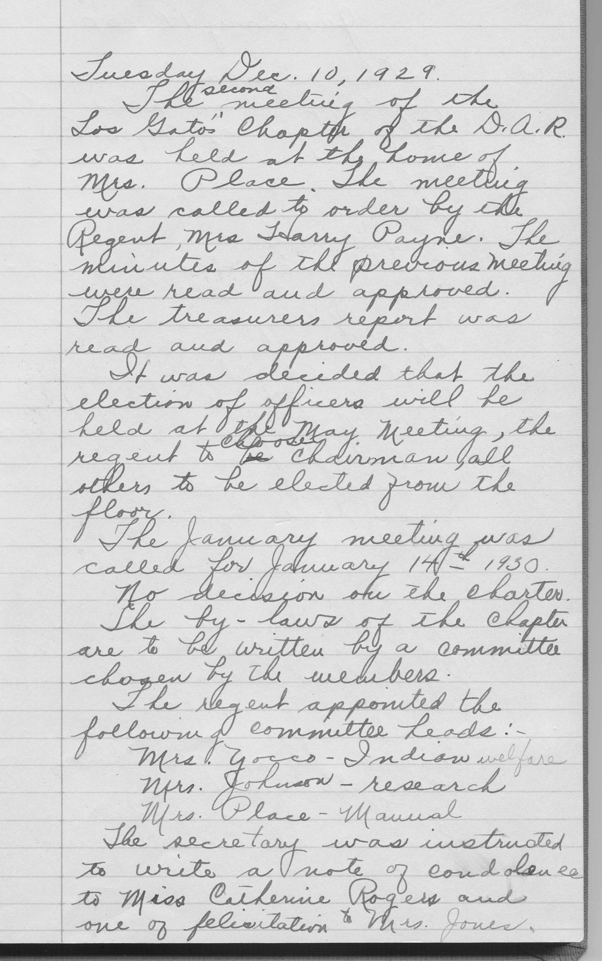 The minutes of the second meeting of the Los Gatos Chapter of the D.A.R., held on December 10, 1929 at the home of Mrs. Place. DAR019Collection