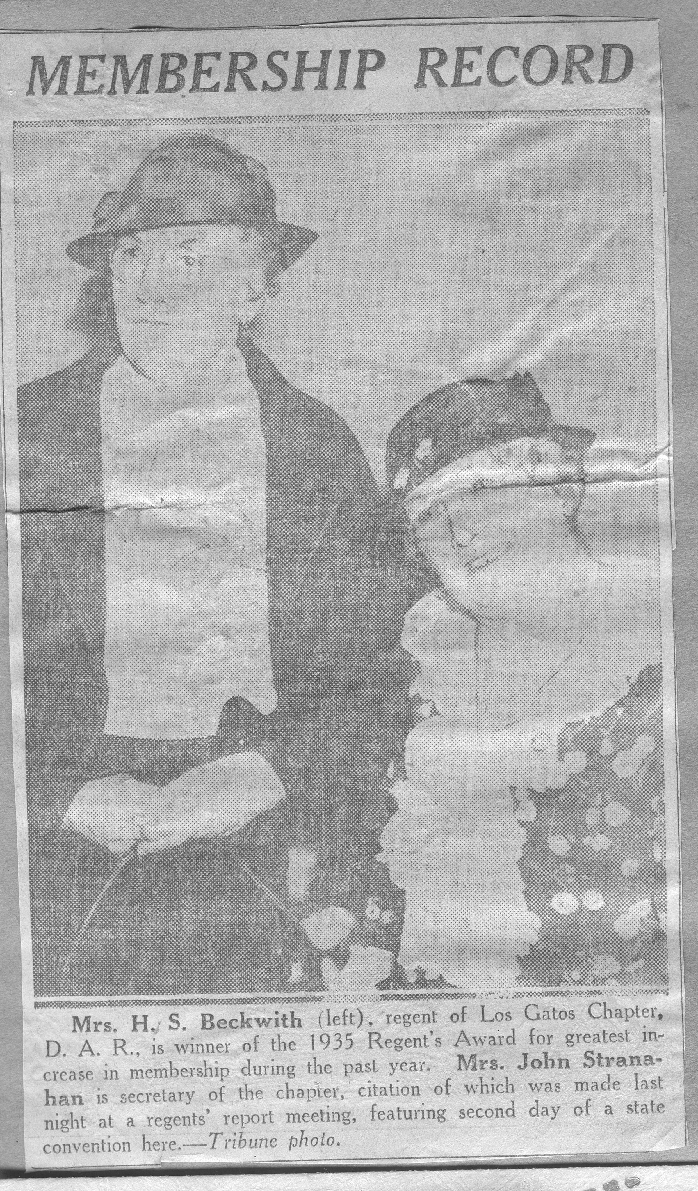 A photo of Mrs. H.S. Beckwith, regent of the Los Gatos D.A.R., winner of the 1935 Regent's Award for greatest increase in membership for the past year. Mrs. John Stranahan is also pictured. DAR010Collection