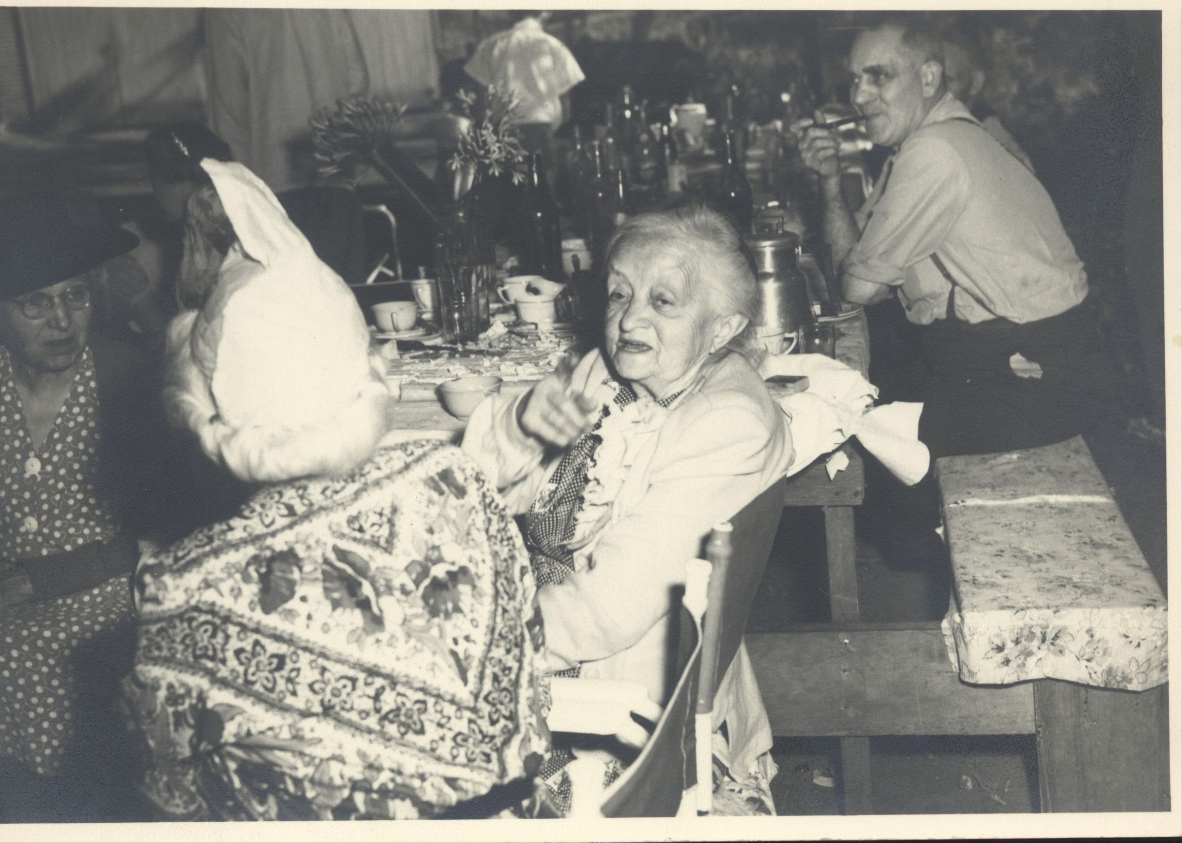 Sara Bard Field (with hat, back to camera) and Lucia Marengo, Vincent's mother, at an Italian family-style dinner party. Vincent and Mary Marengo were employed by C.E.S. Wood and Sara Bard Field at "The Cats" estate for many years. MAR005Collection