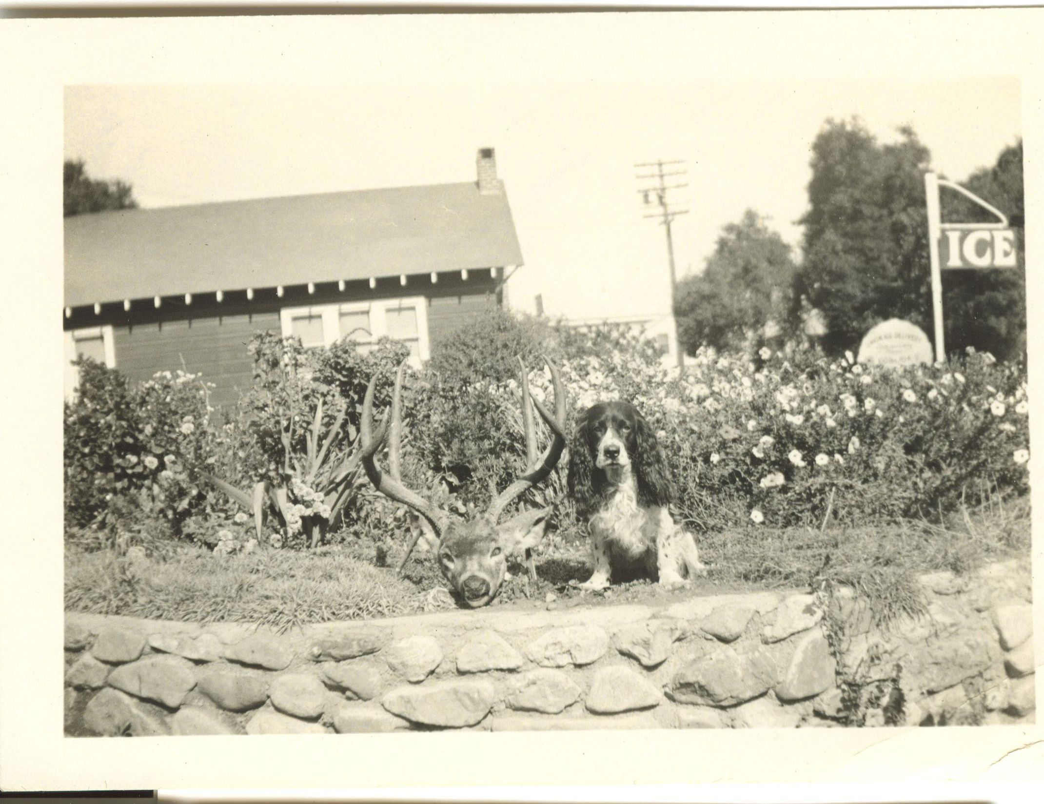 Rowdy the dog sits in front of the American Legion Building on Park Avenue, near the Union Ice House, founded in 1884 by William C. Shore. (The Union Ice House originally sat approximately on the land occupied by the Post Office today, and moved to Park Avenue in 1922.) The men in the Shore family often went hunting for deer. MS013Collection