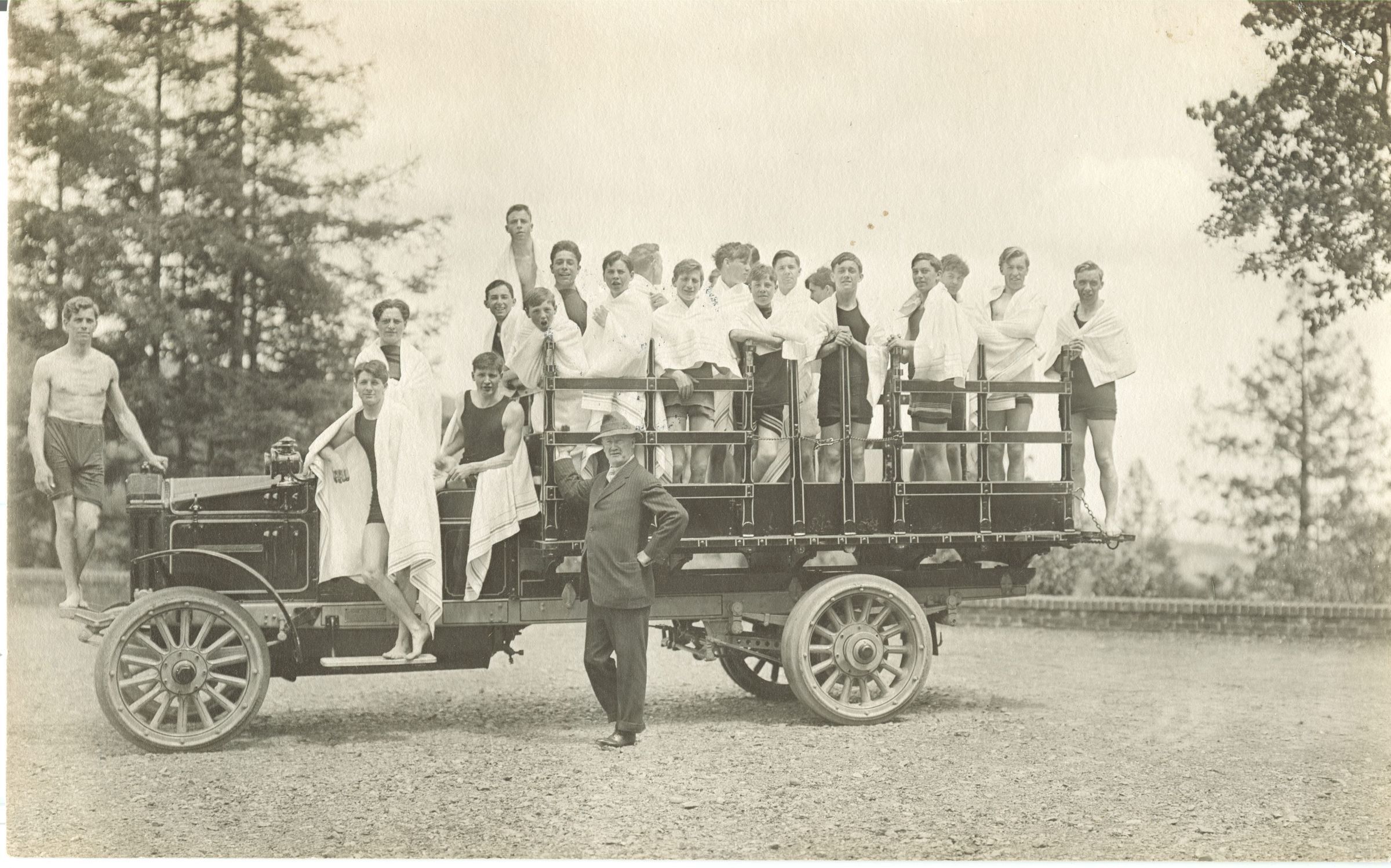 Swimmers on truck at Tevis Estate. Dr. Tevis standing in suit. NVC015Collection