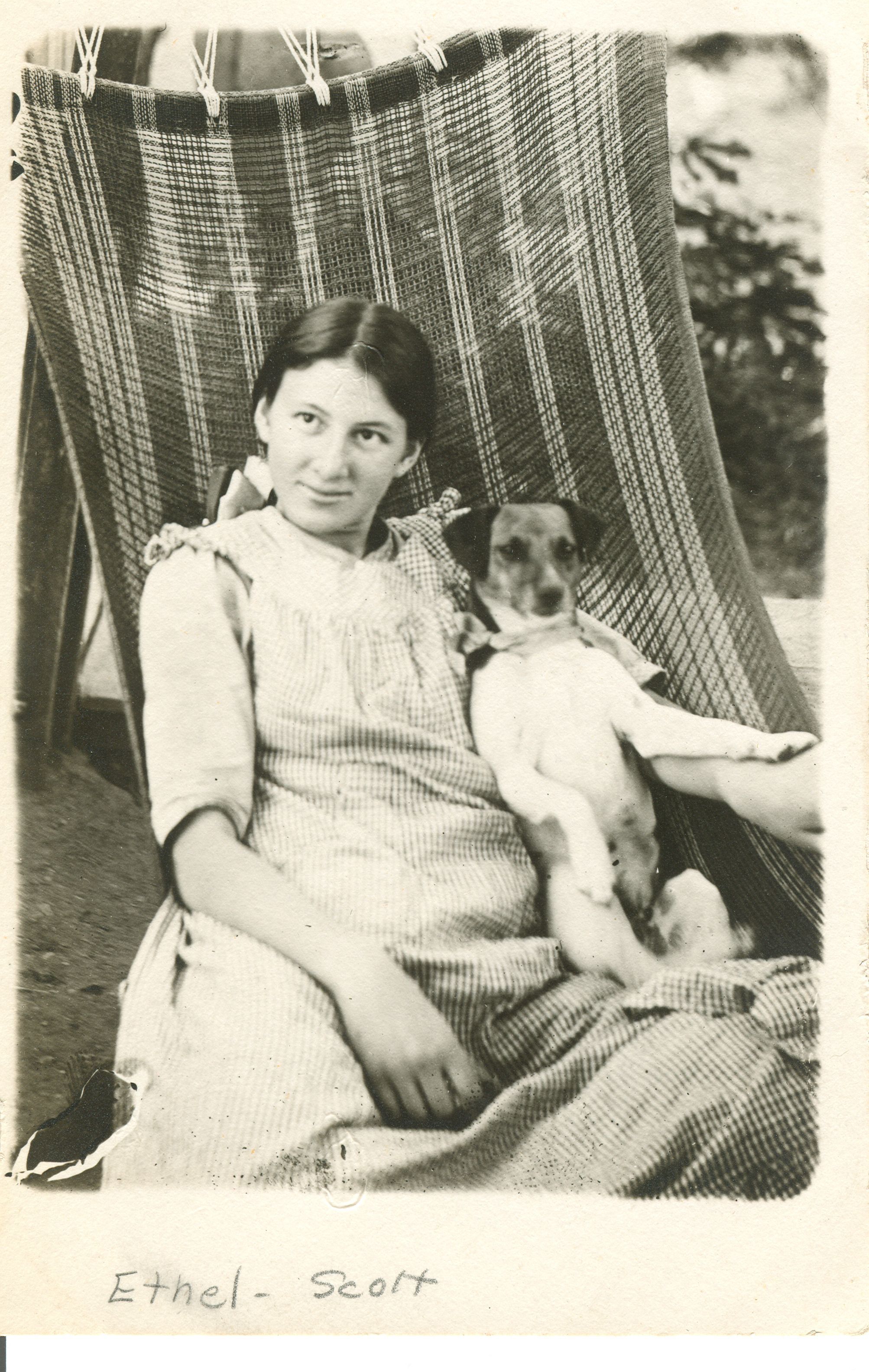Ethel Scott (1898 - 1988) was the daughter of Aaron and Alice Miller Scott. Here she relaxes with her dog in a hammock at the ranch. FIN005Collection