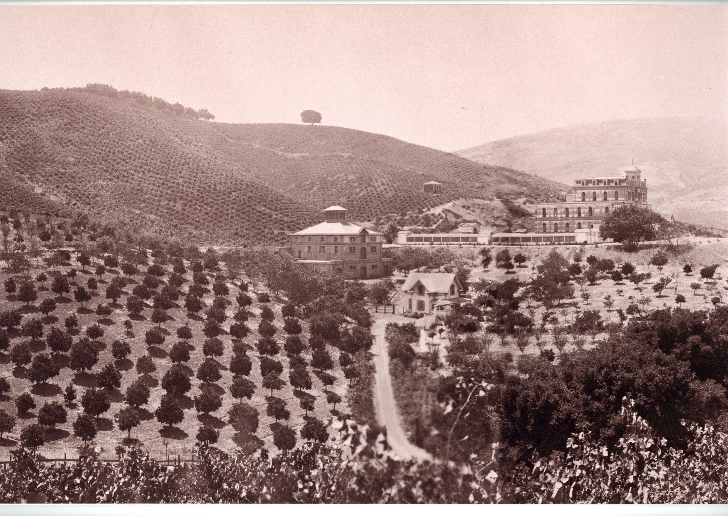 Sacred Heart Novitiate, long view. Shows cloister walk. Lone oak on top of hill is still standing. Arborist says it dates from about 1750. Nightwatchman's house is in front. NVC001Collection