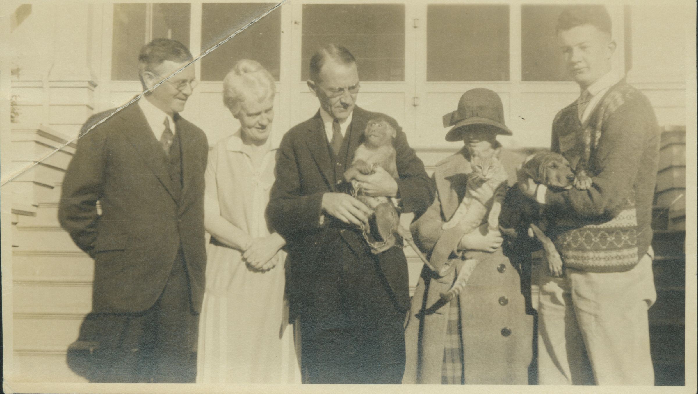 From left to right: Unidentified, Lucy, Dean, Mary and Bill Balch. Also included are family pets, Morocco, the monkey, and a cat and a dog. BBC026Collection