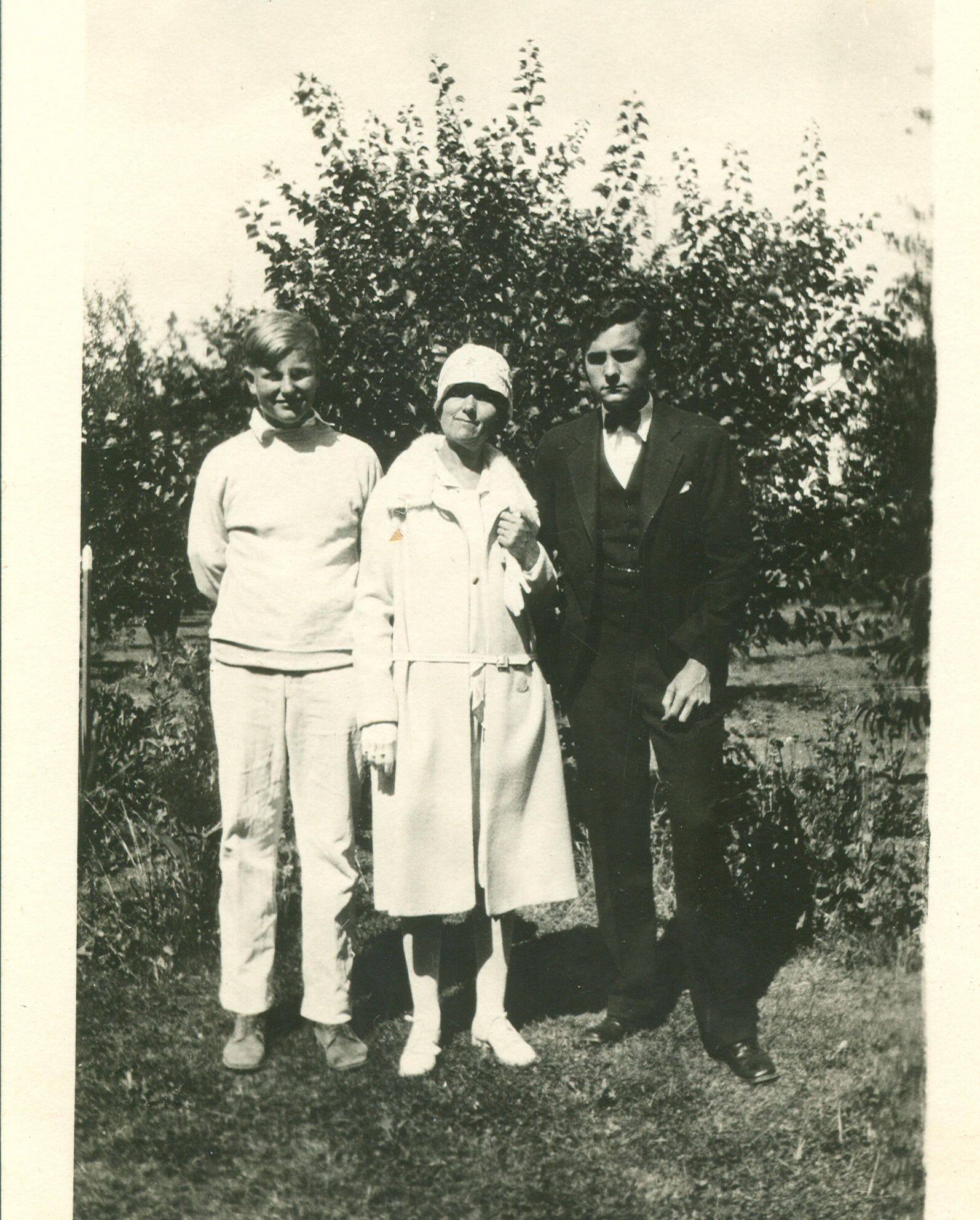 From left to right: Lyman Bergtold, Louise Corkill Bergtold, Fred Bergtold. Taken at Placer Oaks Ranch in Los Gatos. Fred became a stockbroker and later was the owner of the Frank E. Wilbur Co. in San Francisco. BGF021Collection