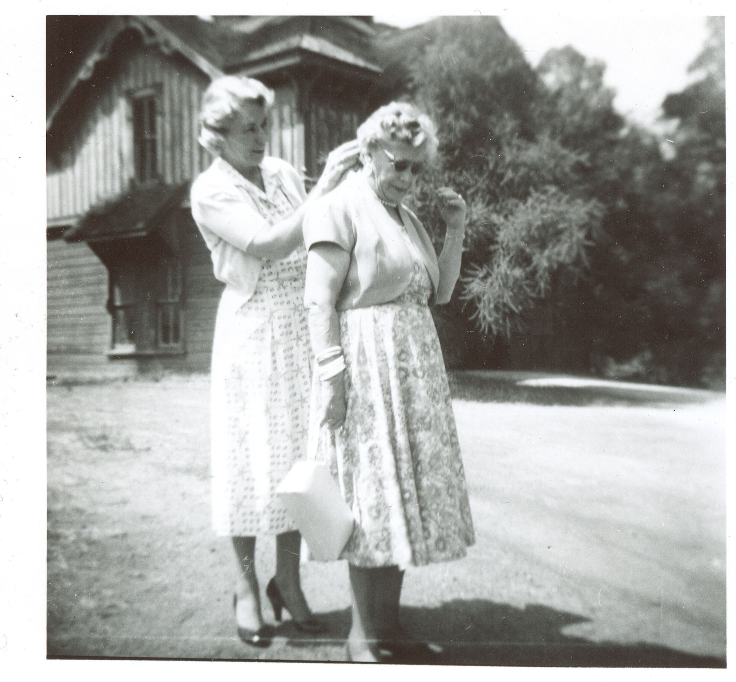 Irma Lyndon Farwell (1880-1964), seen here at the right, stands in front of the Lyndon Heights carriage house circa 1955 with her daughter-in-law Louise Bacigalupi Farwell. Irma Farwell was the daughter of John and Theresa Lyndon. She married J. D. Farwell on April 30, 1902, at St. Luke's Episcopal Church. The carriage house's cupola now sits atop the bandstand in Oak Meadow Park. FAR029Collection