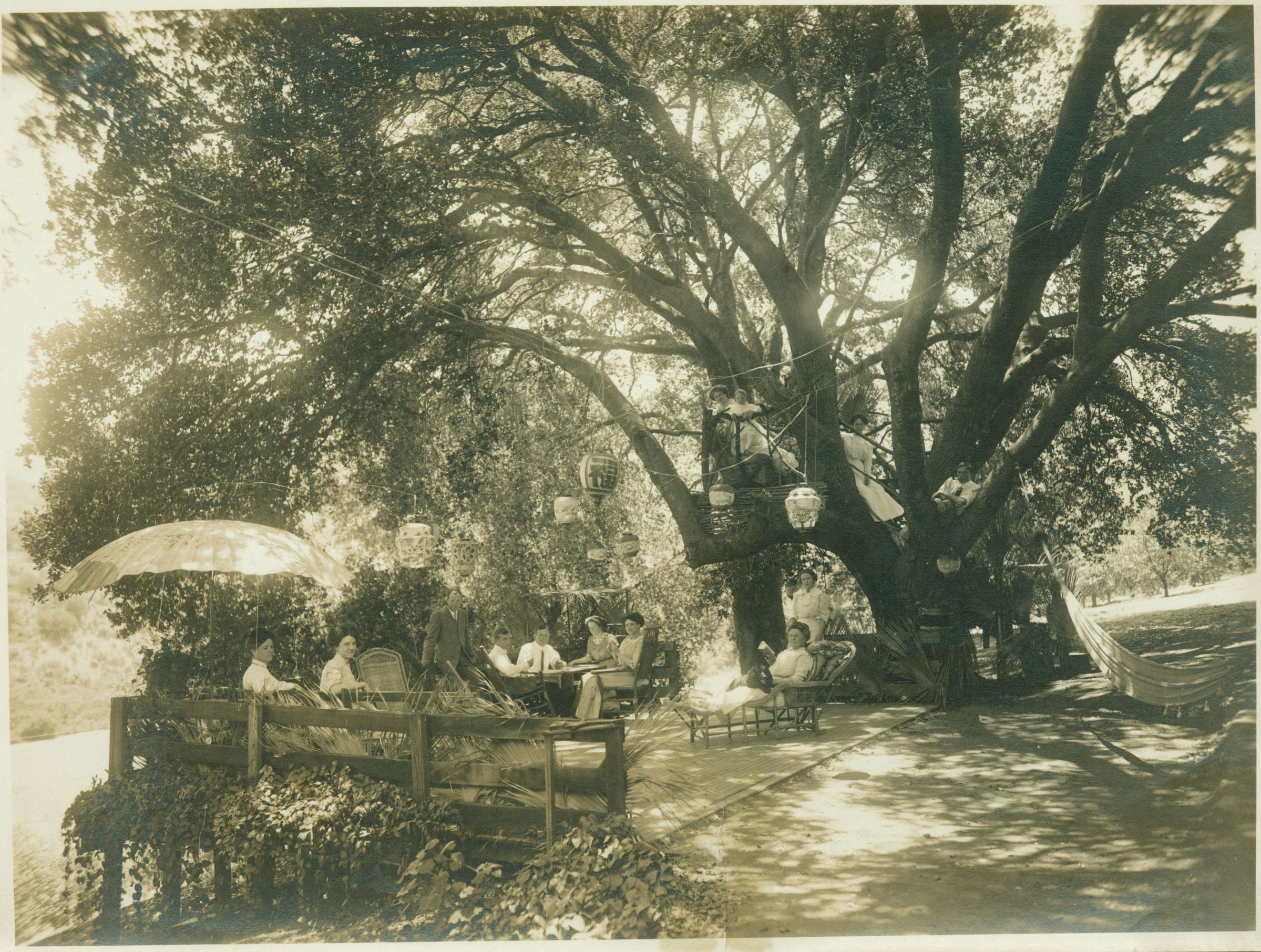 The 1909 Feast of Lanterns committee encouraged residents to participate in the festival by hanging Japanese lanterns in their gardens. Here, the Farwell family is seen relaxing under their display of lanterns, probably at Lyndon Heights. Notice some of the family members perched in the tree. When night fell in Los Gatos, the hillsides sparkled. FAR014Collection