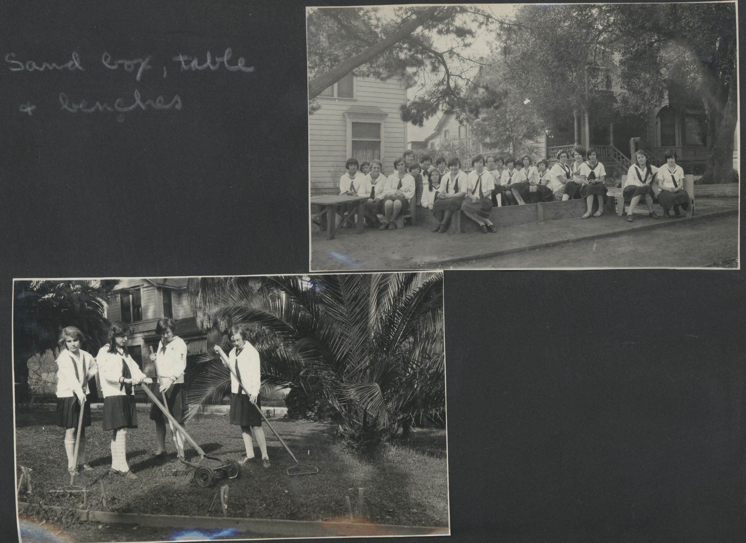 Upper picture: Sandbox, table and benches at the Fairview Plaza site. Bailey, Sterling, Norton and Phelps Lumber Co. donated lumber for benches and a flag pole. Lower picture, four girls working at weeding, mowing and raking the grounds. CFG002Collection