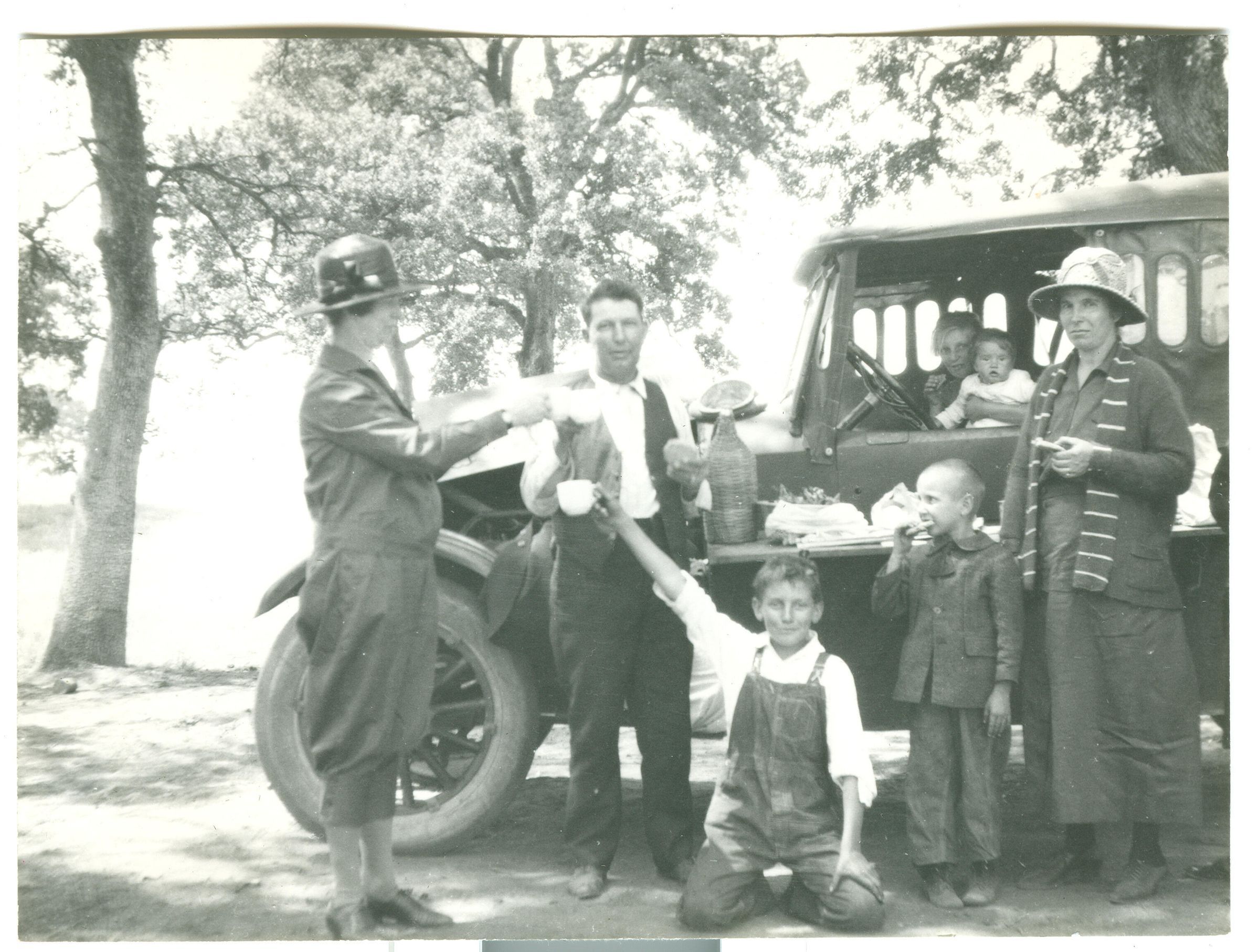 The location of this photograph was probably Memorial Park in Los Gatos. Victor and Maggie Fink are standing on either side of the camping table, and oldest son Victor is kneeling in front. The woman at left may have been a Scout leader. FIN051Collection