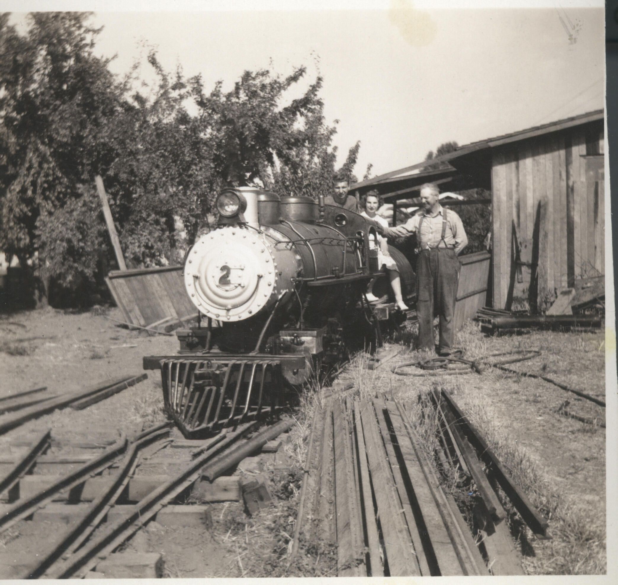 When Billy Jones purchased the little 2-Spot, he intended to build a backyard railroad he could operate with his two sons. Determined to return his engine to steam, Jones attended night school to acquire the needed skills, putting in many long hours at his company's Mission Bay Shops and constructing a tender using a fuel oil delivery tank. On August 13, 1942, Jones steamed up the 2-Spot for the first time. Son Neal and daughter Geraldine were on hand to share this special moment on the ranch. JON006Collection