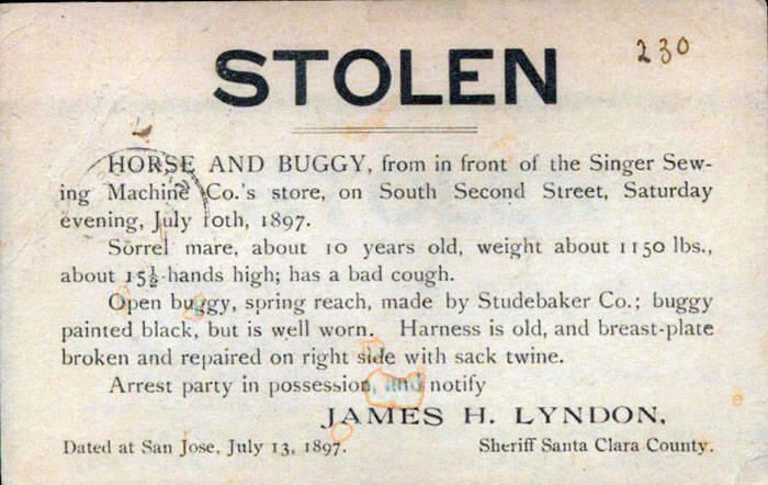 Poster describing a stolen horse and buggy, issued by Santa Clara County Sheriff James Lyndon in 1897. The horse is described as having a "bad cough." AD010Collection