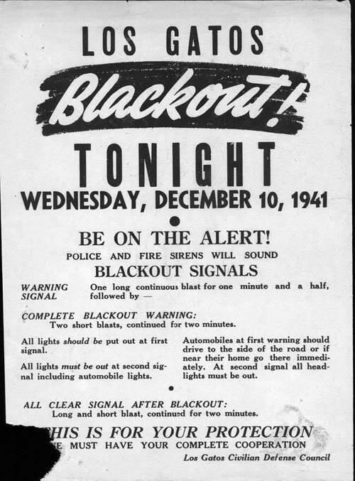 Notice of a complete blackout scheduled for Los Gatos on Dec. 10, 1941, during World War II. Issued by the Los Gatos Civilian Defense Council. AD001Collection