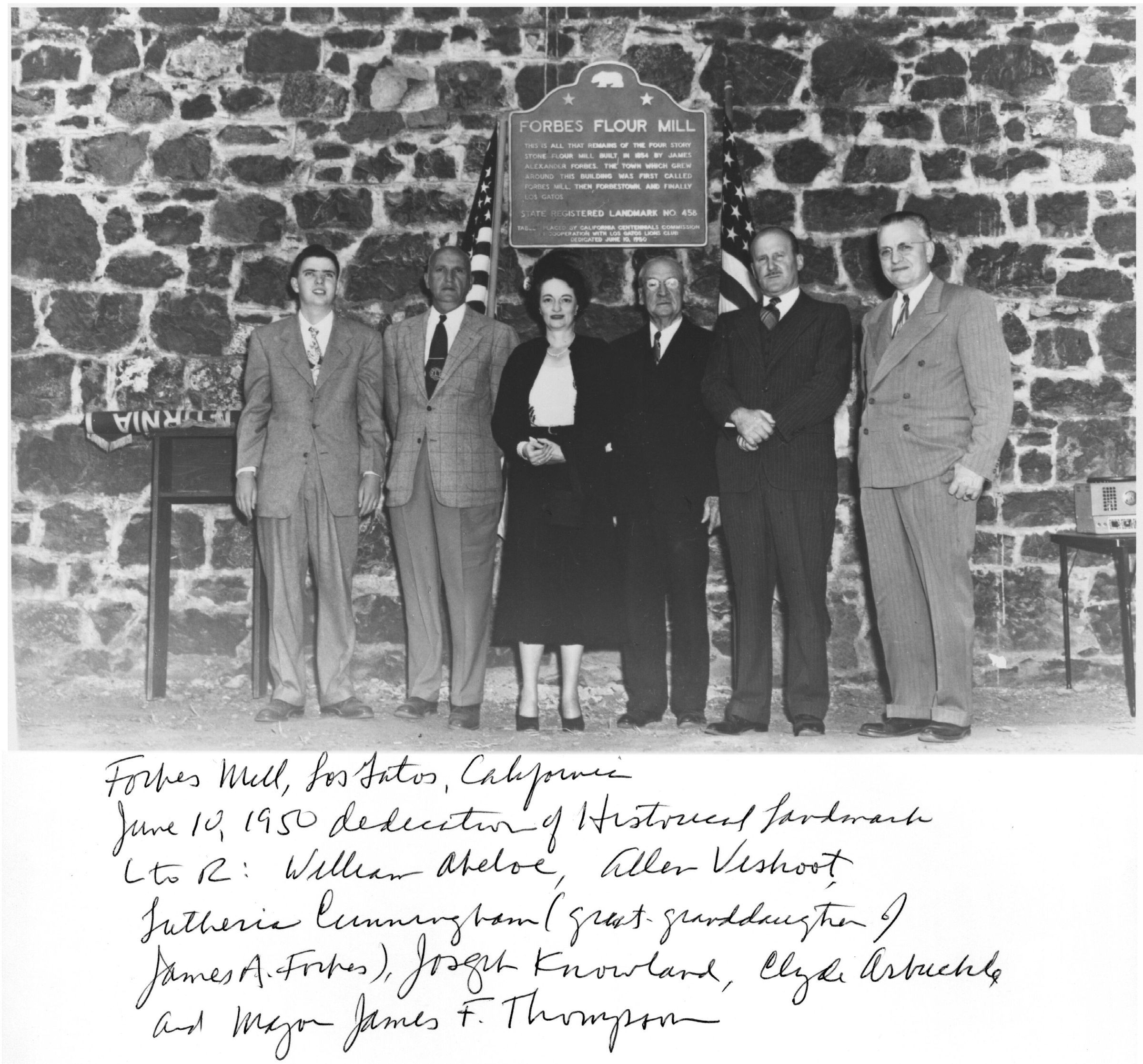 On June 10, 1950, the Forbes Mill annex was dedicated as California State Historical Landmark number 458. From left to right: William Abeloe, a leader in the landmark movement; Allan S. Vishoot Sr., president of the Los Gatos Lions Club; Lutheria Cunningham, great grandaughter of James A. Forbes; Joseph Knowland, chairman of the California Centennial Commission; Clyde Arbuckle, San Jose City Historian; and James F. Thompson, mayor of Los Gatos. FB009Collection