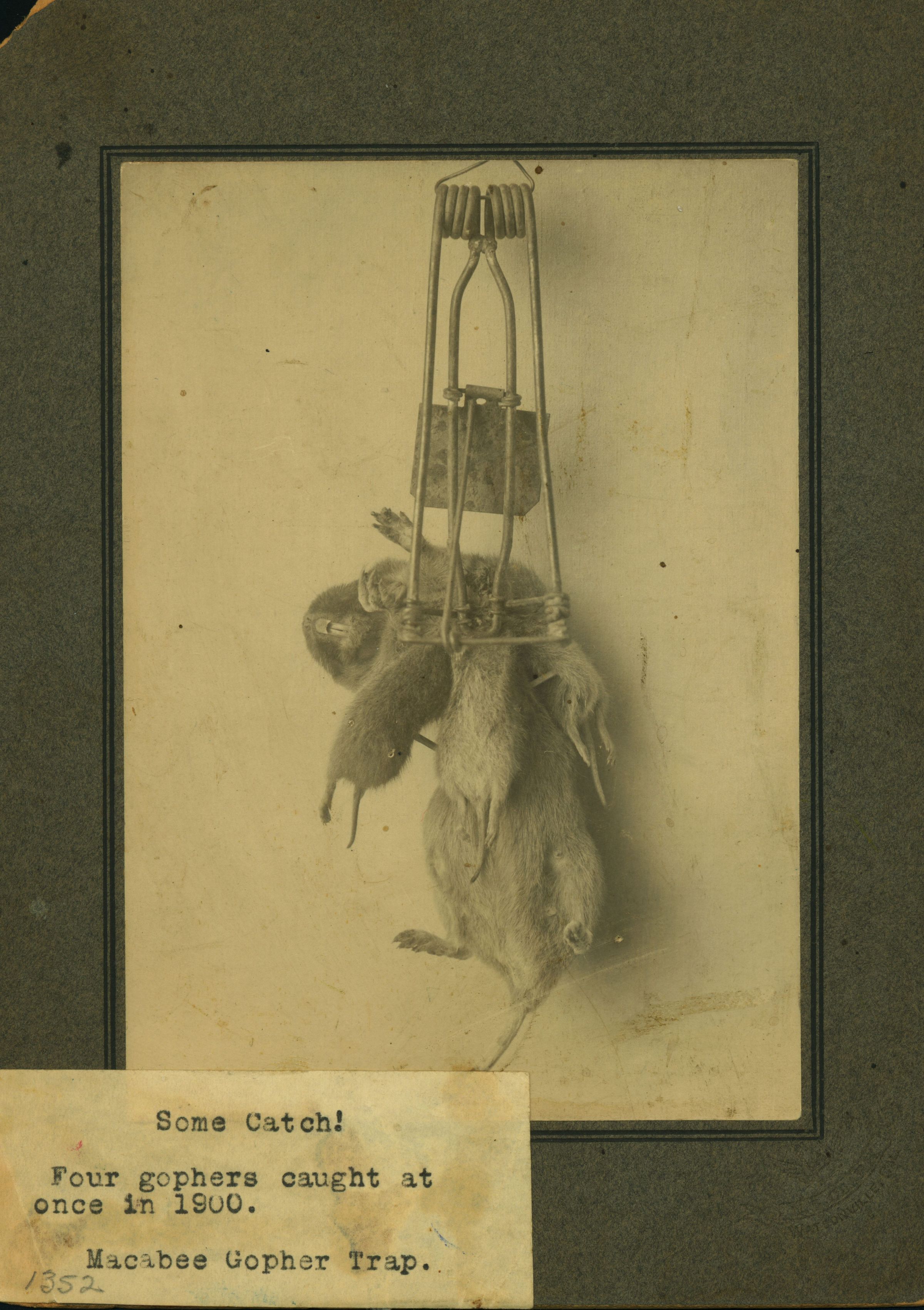 One large and three small western pocket gophers all caught in one Macabee Gopher Trap in 1900. RID023Made/Created