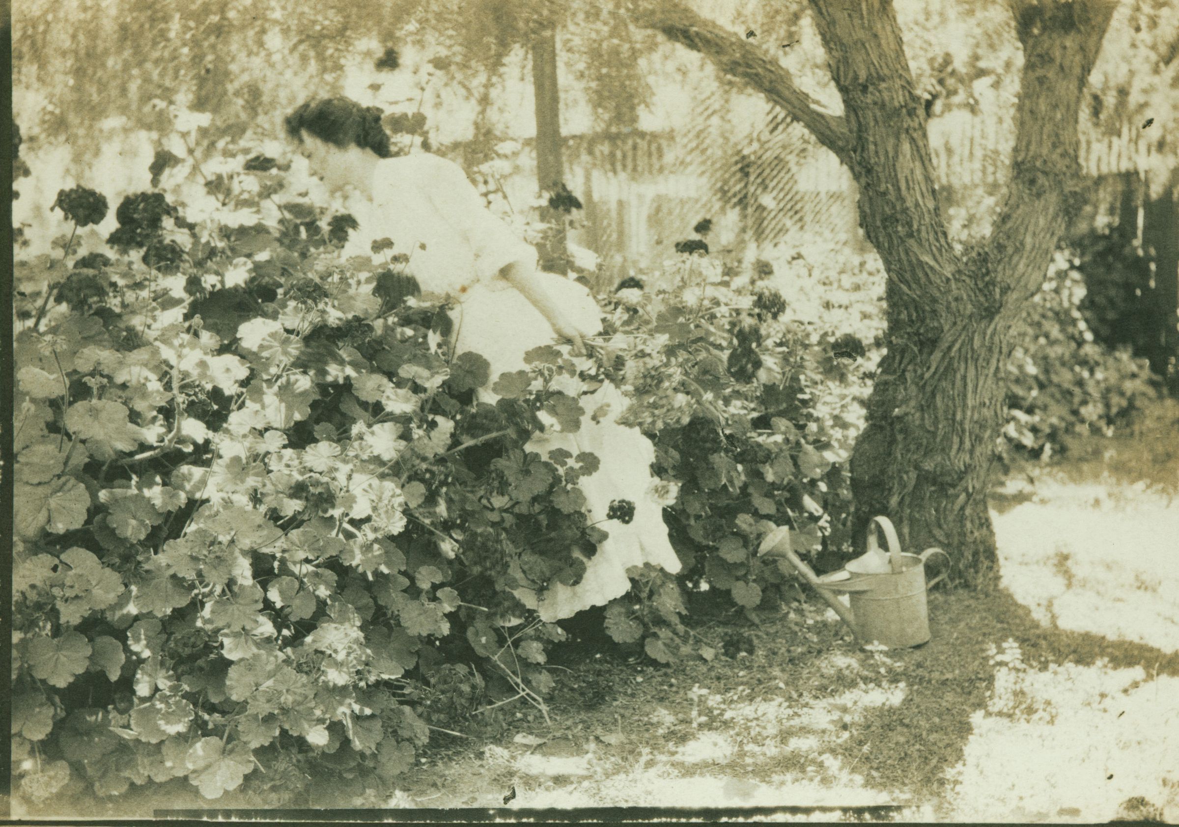Mary Isabella Tobin (1876-1960) is shown in this photograph taken sometime between 1900-1905 in the back yard of 128 East Main Street. Her giant patch of geraniums illustrates how easily flowers grow in the temperate climate of Los Gatos. Mary was born in Santa Clara, before her family moved to Los Gatos circa 1881. She had just reached 84 years of age when she died on February 27, 1960 in a local rest home. According to her obituary, which ran on the front page of the Los Gatos newspaper, a requiem mass was said for her at St. Mary's Church on March 1, 1960, and she was buried in the family plot at Los Gatos Cemetary. The obituary also stated that Mary was a graduate of Los Gatos High School, but it is more likely that she attended some of the first "graduate" classes offered. Census records reveal that she was born on February 15, 1876, but as the years went on she claimed to be several years younger than she was, as did her two sisters, Janet and Helen. TOB019Collection