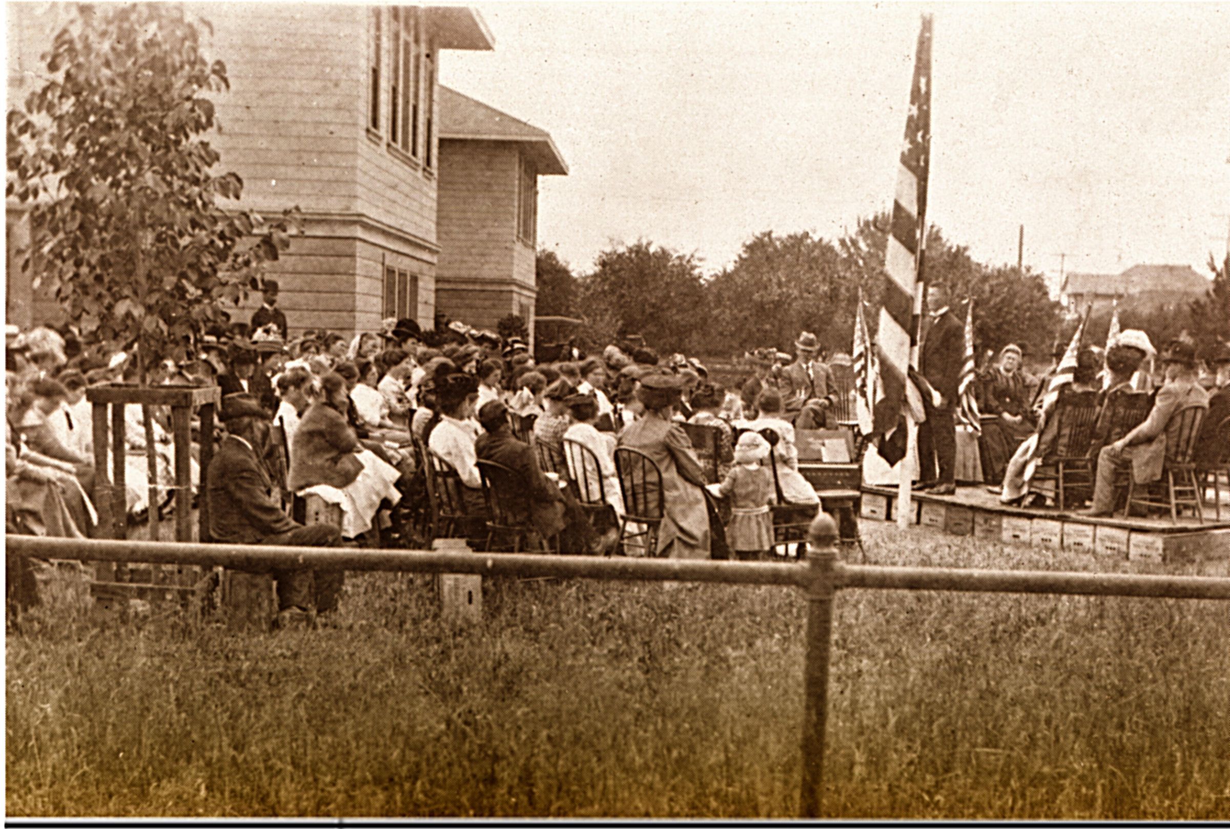 Formal dress sitting, flag, piano, stage. PE023Collection