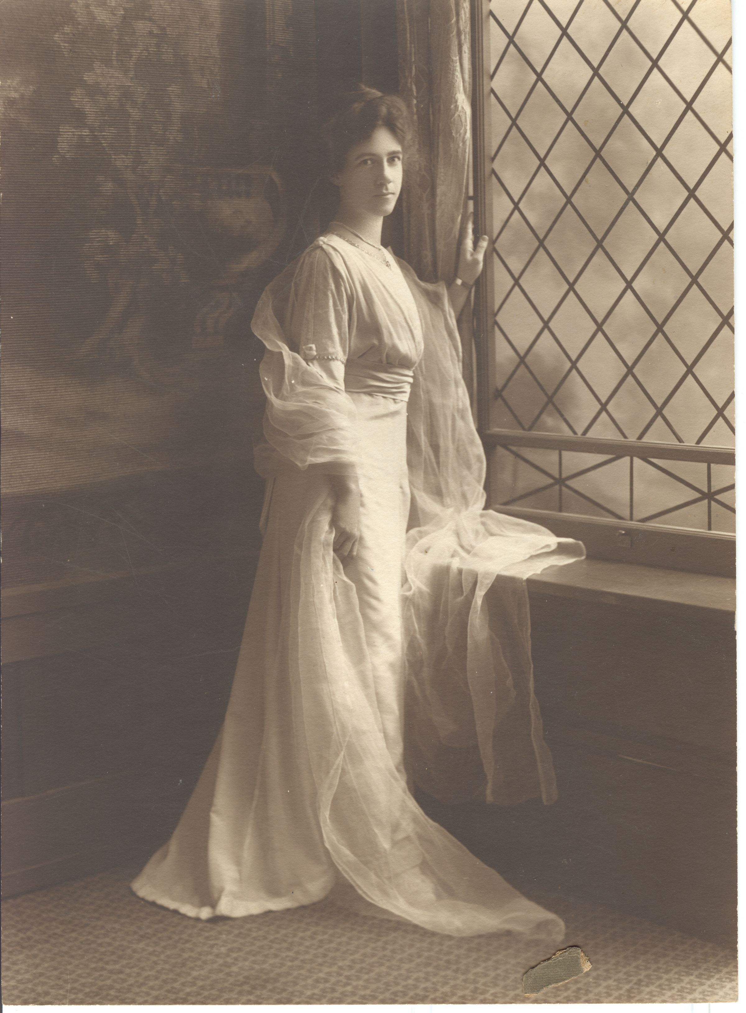 According to the 1910 Federal Census, Helen was 24 years of age, living on Santa Cruz Avenue with her mother, Georgianna Gibson. She lists her occupation as bookkeeper. In the photograph, Helen is standing at a multi-paned window. FRA045Collection