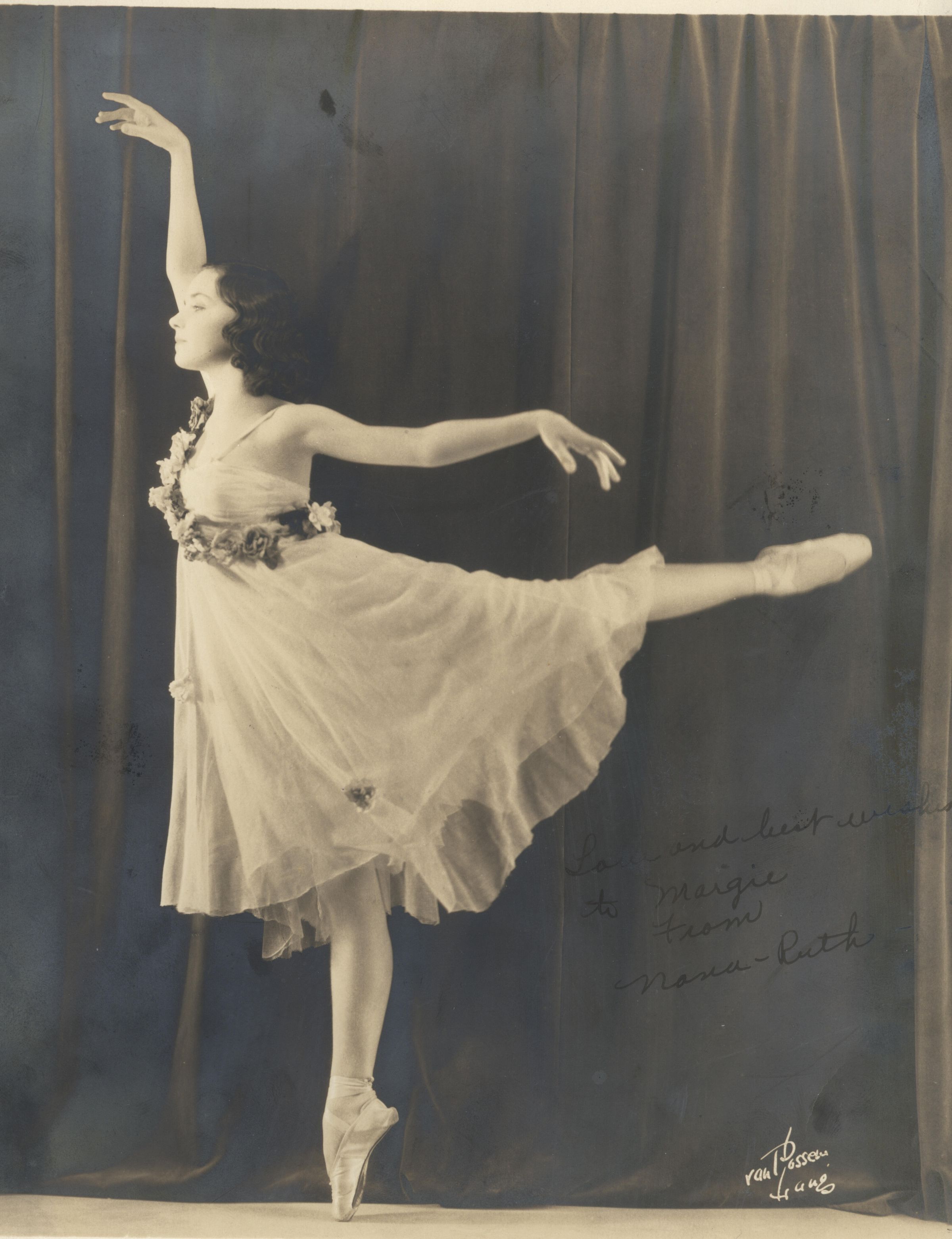 Nana-Ruth Gollner (1919-1980) was a ballerina who overcame infantile paralysis to become the first modern American ballerina to achieve the rank of Prima Ballerina in a European ballet company. Part of her therapy was to excercise in sand; then she took dance lessons to strengthen her feet. The Gollner family moved to Edelen Avenue in Los Gatos, and Nana attended University Avenue School and danced in school shows. She went to Hollywood, then joined the Ballet Russe, the Ballet Monte Carlo, and then the American Ballet Theater. She danced throughout Europe and South America. She appeared on the cover of Life magazine on March 20, 1944. PE112Collection
