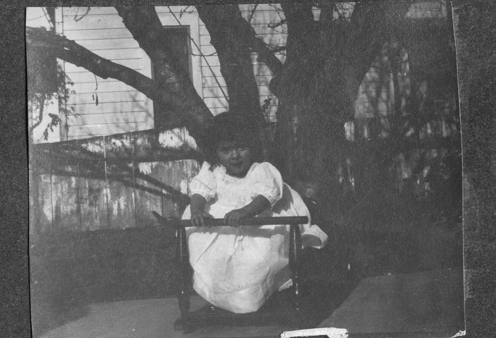 This is a photograph of the younger of the two daughters of Hanna "Anna" Worden and Frank Gonzales. It was taken at the Gonzales home on Harrison Street in San Jose. This child is a great-granddaughter of Jose Maria Hernandez, grantee of the Rancho Rinconada de los Gatos. KEM017Collection