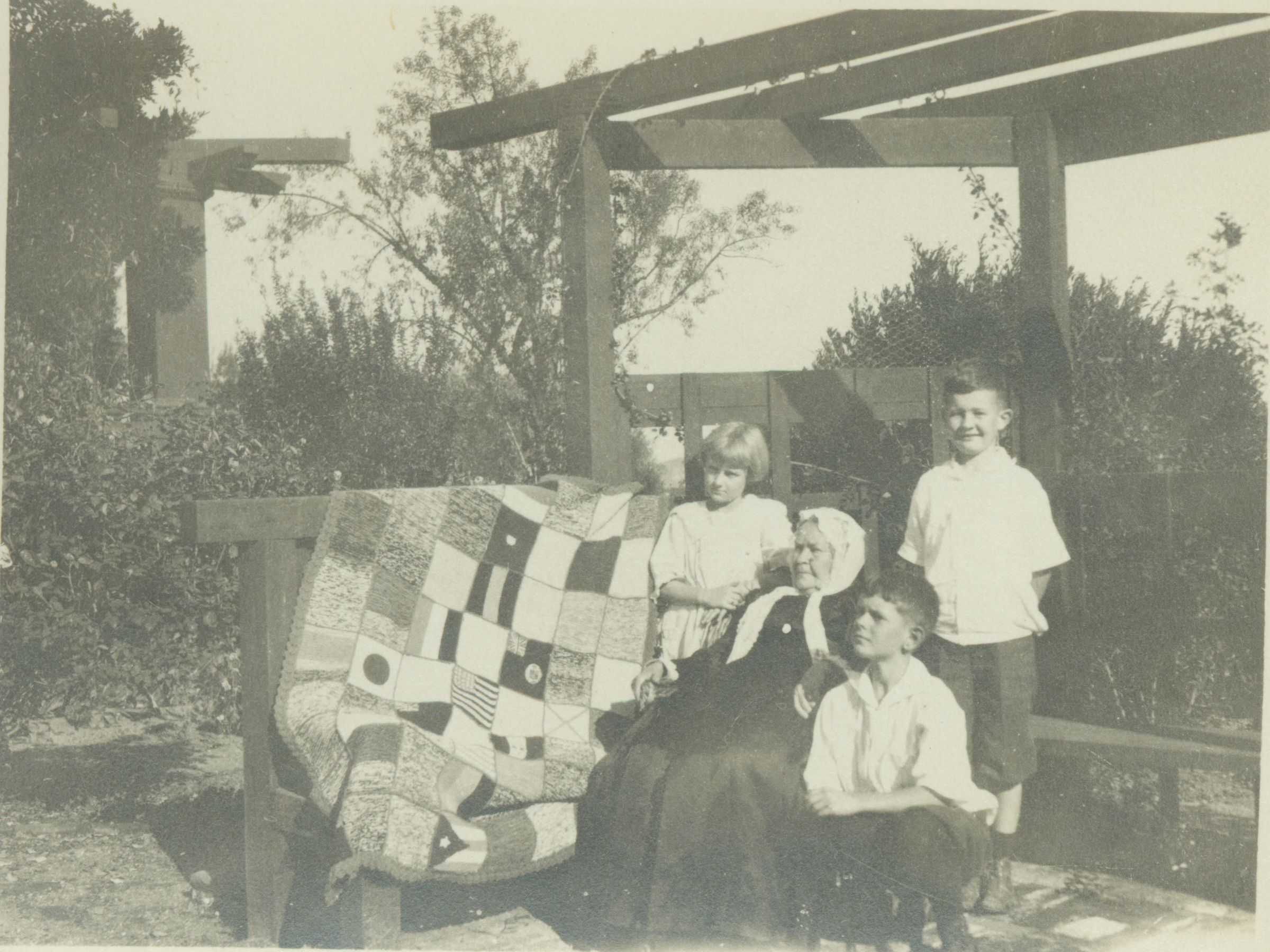 Grossie Balch with Mary and Bill Balch and Don Case posing under the arbor of the house on Massol with an afghan made and sent to the Queen of Belgium with the flags of the Allies in World War I. BBC029Collection