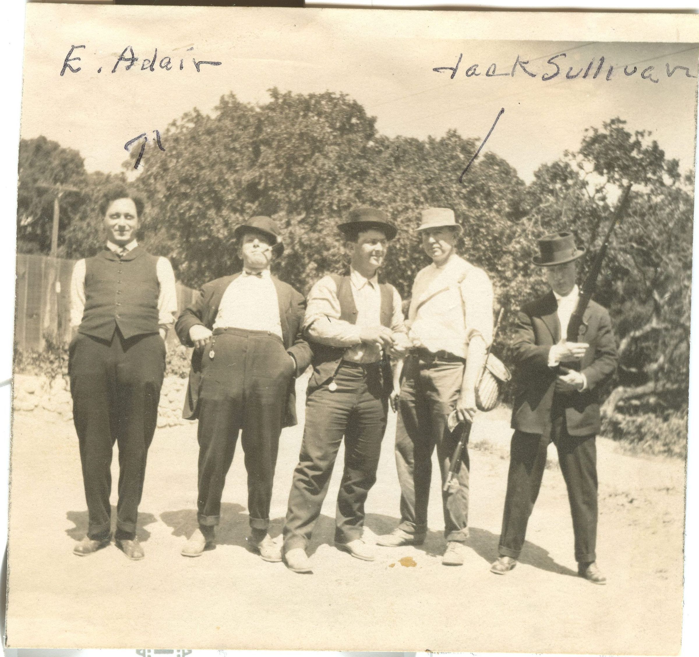 Oliver Manfredi Sr., one time vineyard master at the Novitiate Winery is second from the left. Ernest Adair and Jack Sullivan are also identified in the photo. Jack Sullivan served as Fire Chief from 1920 - 1955. The Tait Avenue firehouse was constructed during his tenure. MS017Collection