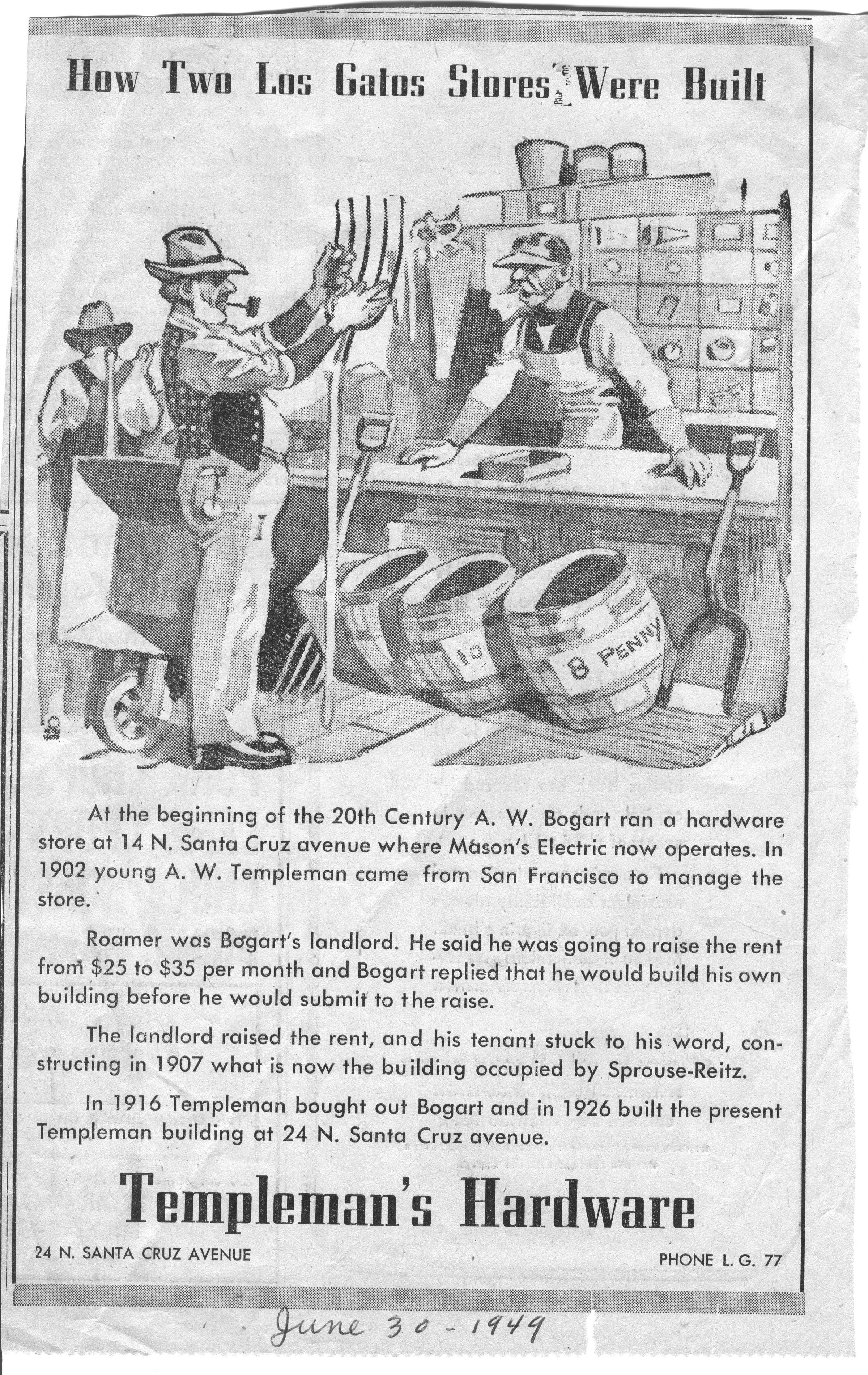 This June 30, 1949 ad for Templeman's Hardware states that A. W. Templeman arrived in Los Gatos in 1902. The family records the date of his arrival as 1905. In 1949, you could reach the store by phoning LG 77. TEM009Collection