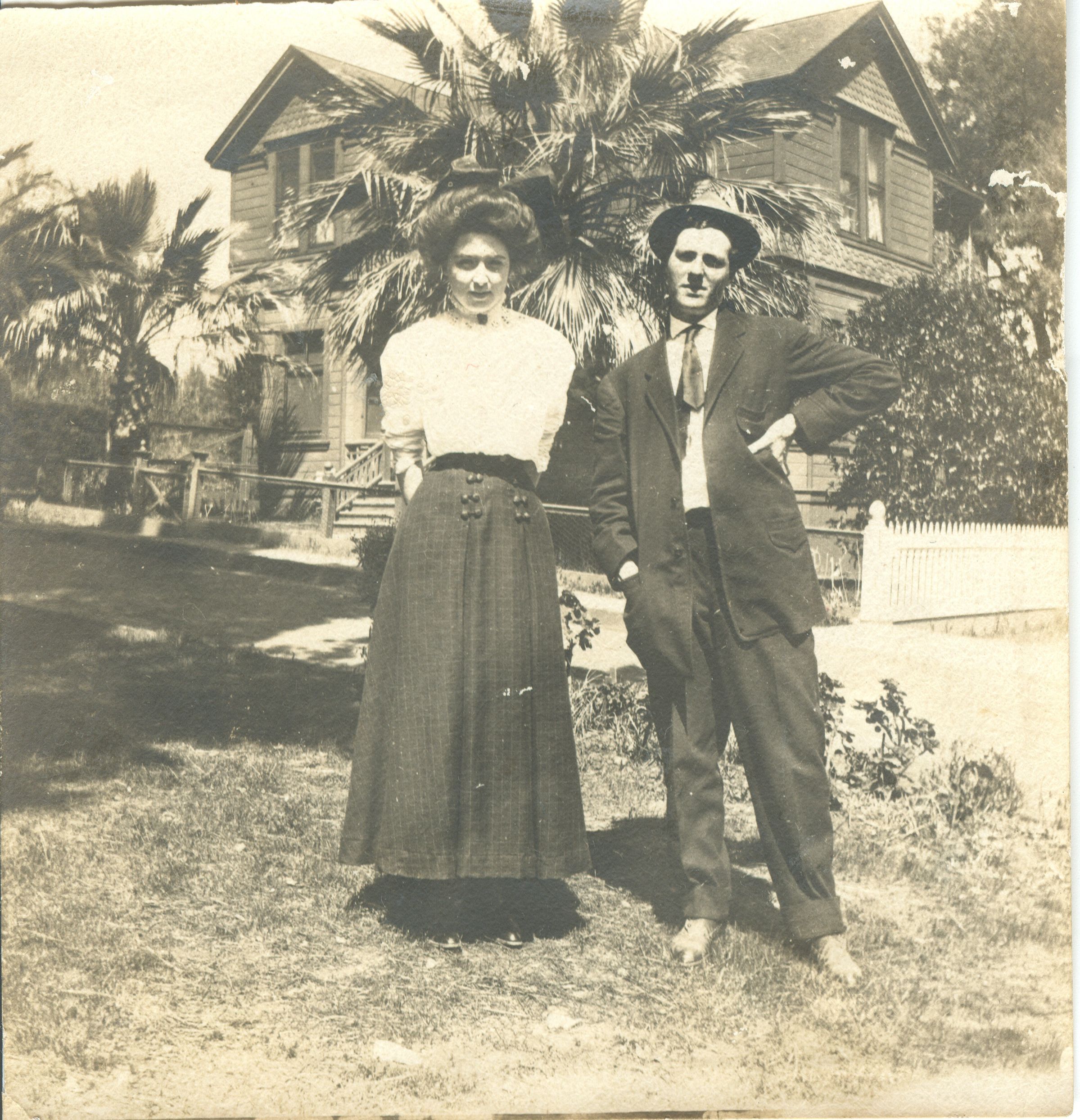 A beautifully dressed and coiffured Marian Hewitt, a friend of Lucile Franks, and an unidentified man pose for a photograph in about 1910. The location is probably in front of the Hewitt home, at either 10 Almendra or on Tait Avenue. Directories show that in 1895-96, Benjamin and Joseph R. Hewitt owned Hewitt Brothers Hardware on Main Street in Los Gatos. FRA040Collection