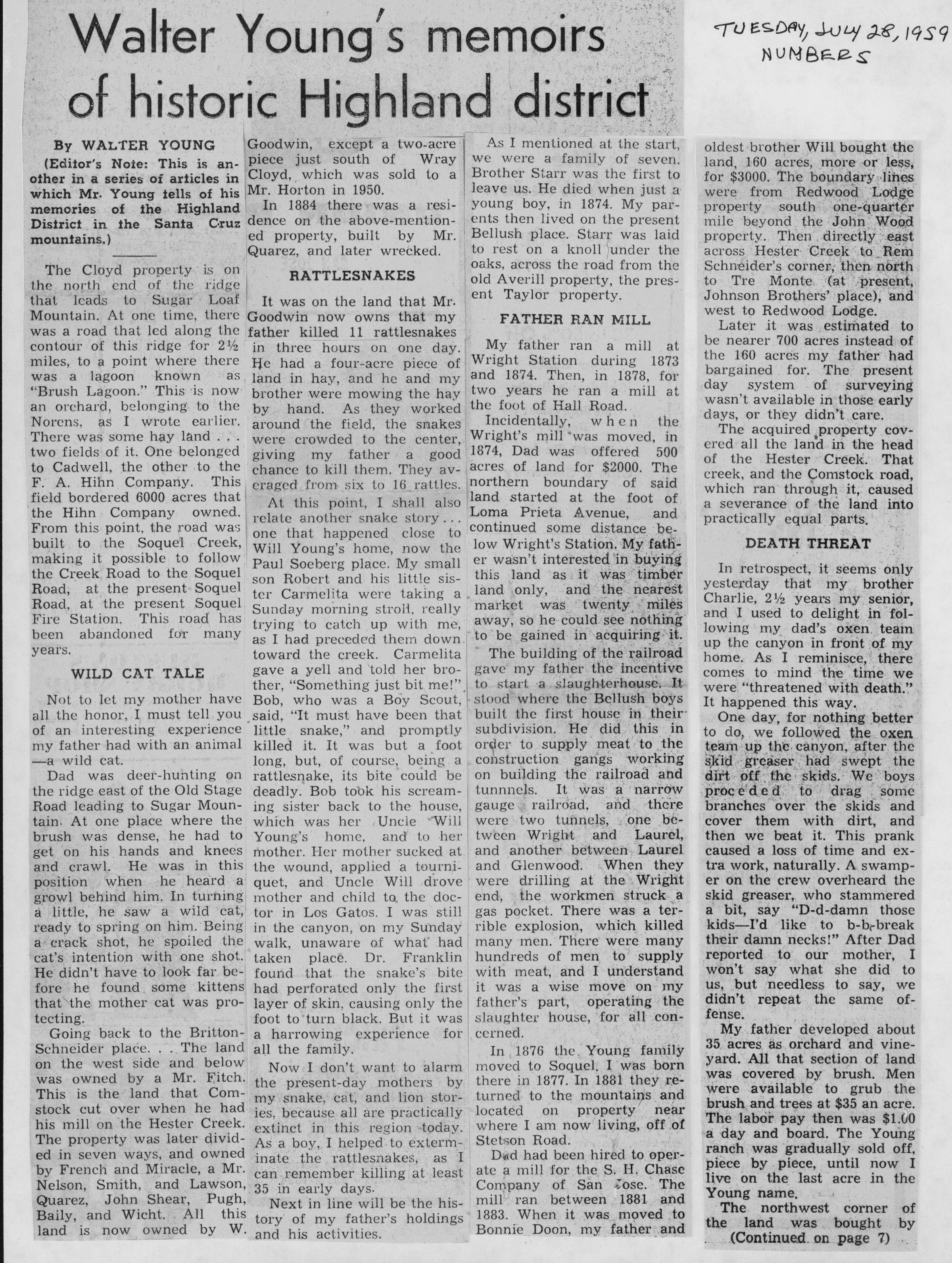 Walter Young's memoirs of the historic Highland District appear in this news article, which ran in the Los Gatos Times Observer on July 28, 1959. WIL012Collection