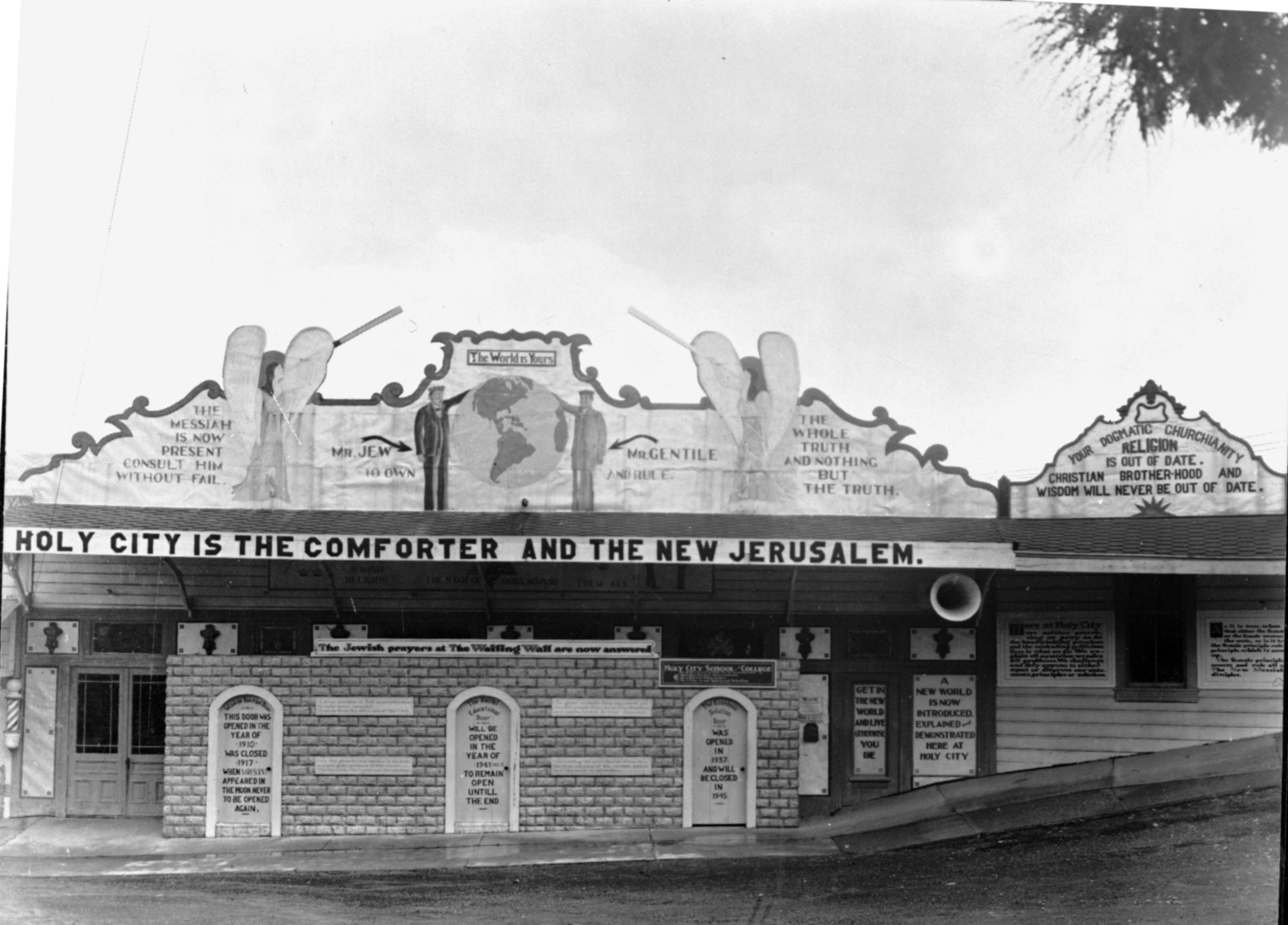 Banner on building reads "Holy City is the Comforter and the New Jerusalem." BA043Collection