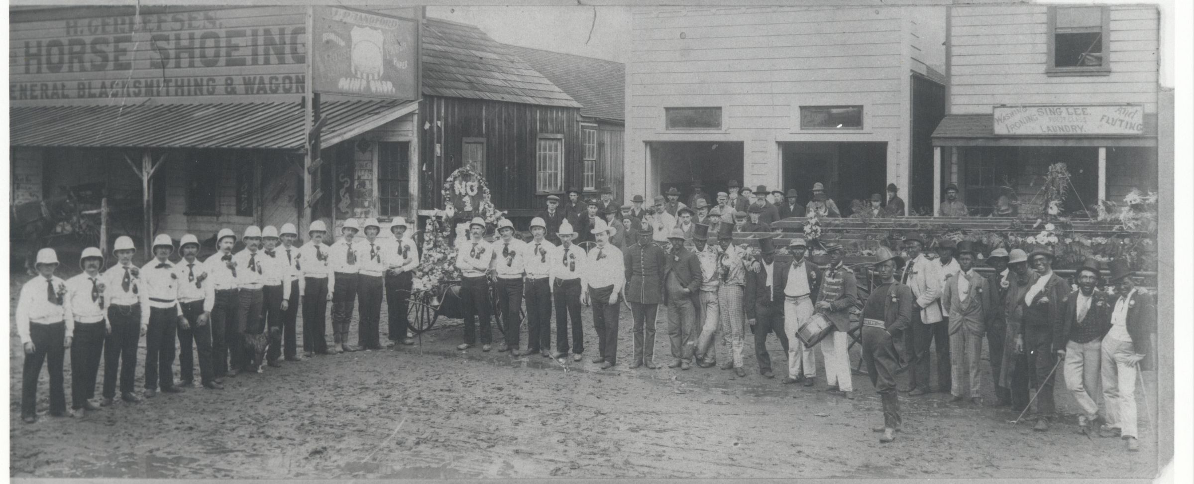 The majority of buildings in Los Gatos were built of wood, and fire was an ever-present threat. Volunteer fire brigades were the only source of protection prior to 1886 when two hose companies (one on each side of the bridge) were formed. Company Number 1 is shown here. It was located opposite the train depot. For an unknown reason some of the men appear in "black face." Dick Shore, standing under the "No. 1," was fire chief for for 18 years. DIS002Collection