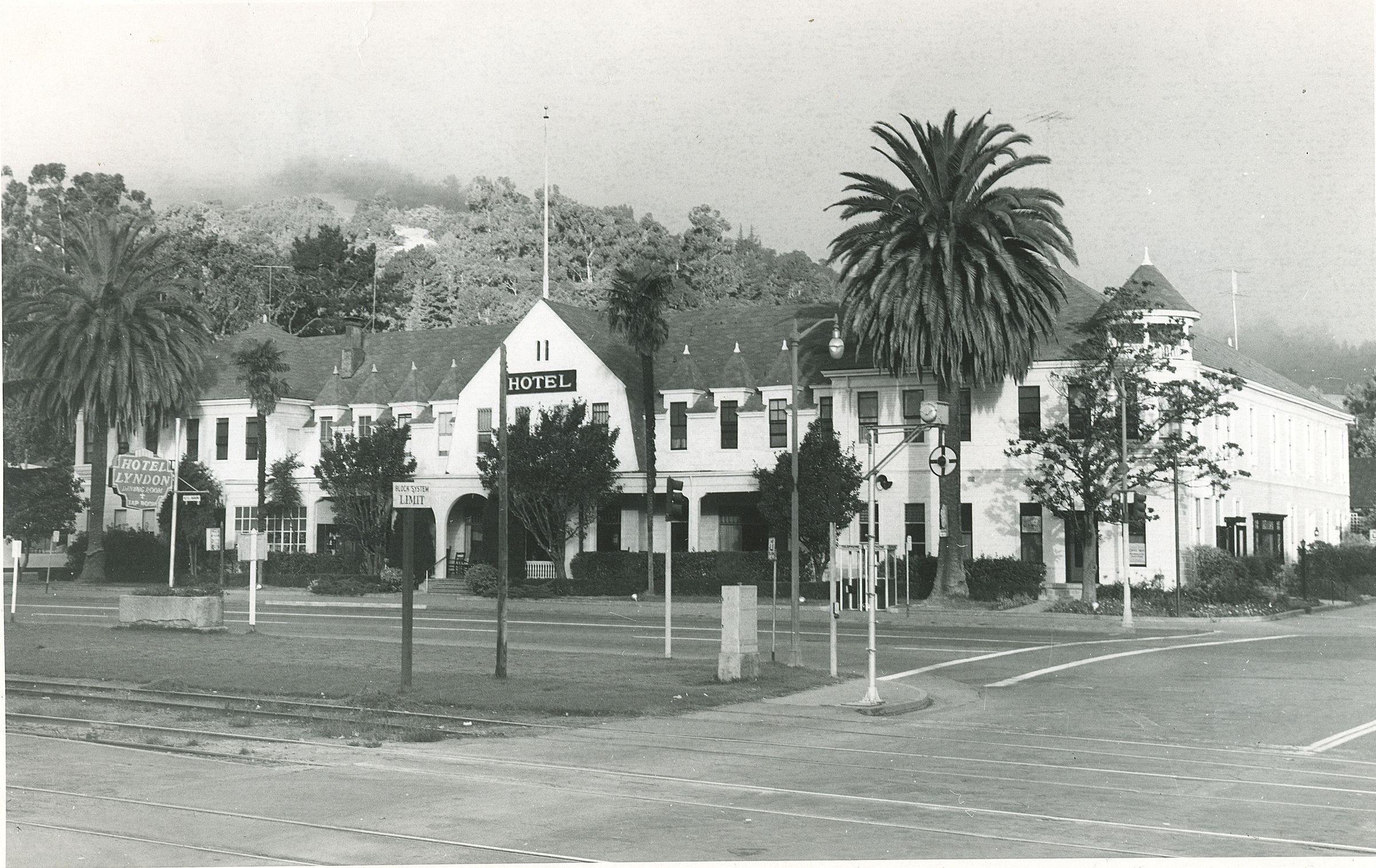 Photograph of the elegant Lyndon Hotel. Caroline E. Baggerly lived in the room at the northwest corner under the turret. She was the wife of Hiland Baggerly, and served as society editor for both of her husband's newspapers, the San Jose News, and later the Mail-News of Los Gatos. "Hi" and Caroline's adopted son was John Baggerly. BA105Collection