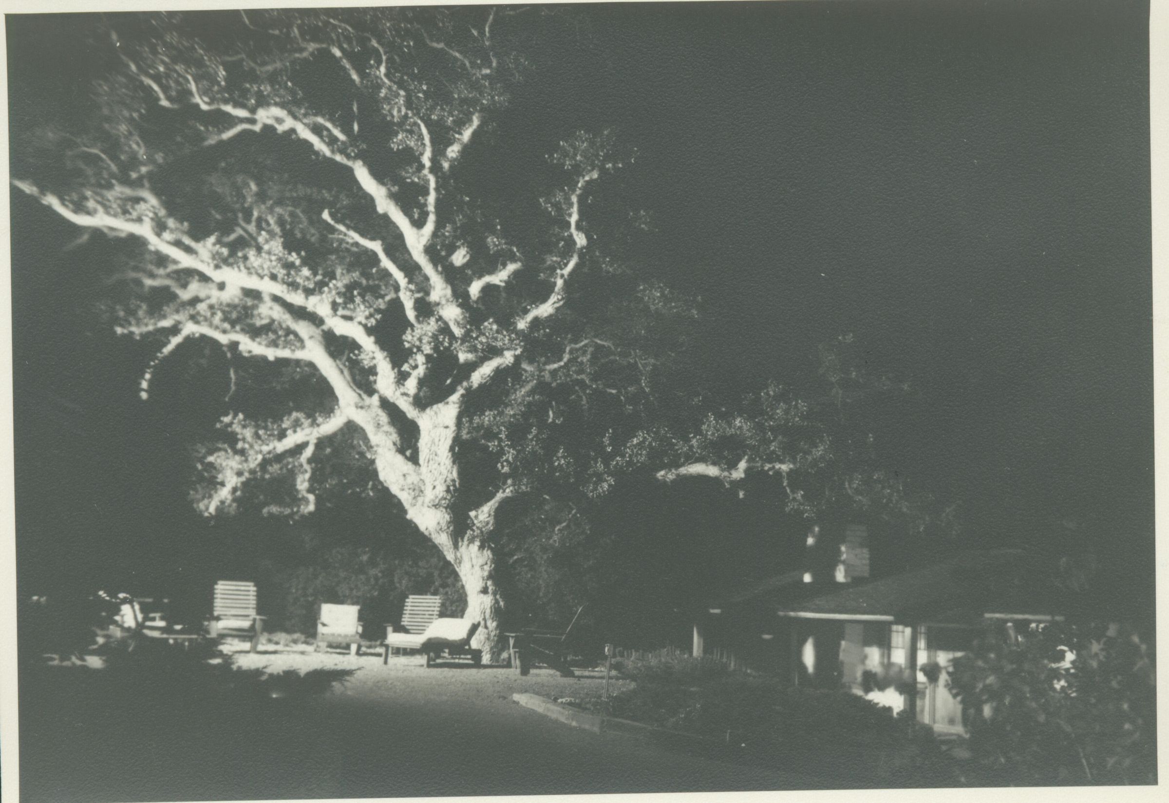 Unidentified Los Gatos house with large oak tree. Photograph taken at night in 1947. RES297Collection