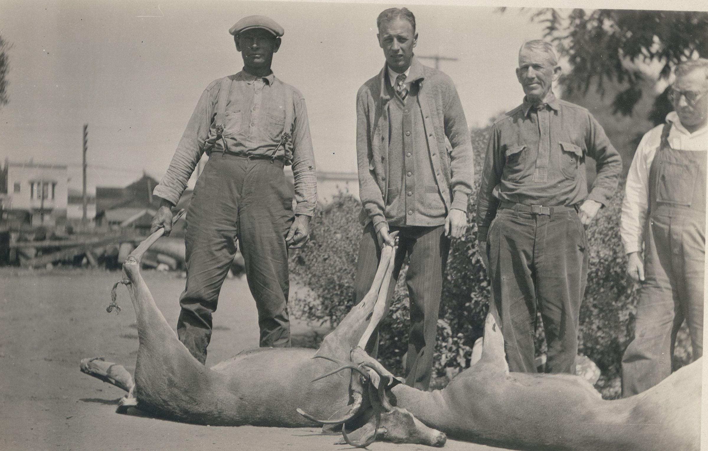 Top Photo: Left to right: Dick Shore, Dick Blake, Jack Sullivan. They are standing in Nellie Shore's stone bordered flower bed at 36 Park Avenue. Bottom Photo: Dick Shore and others display their catch. SHU039Collection