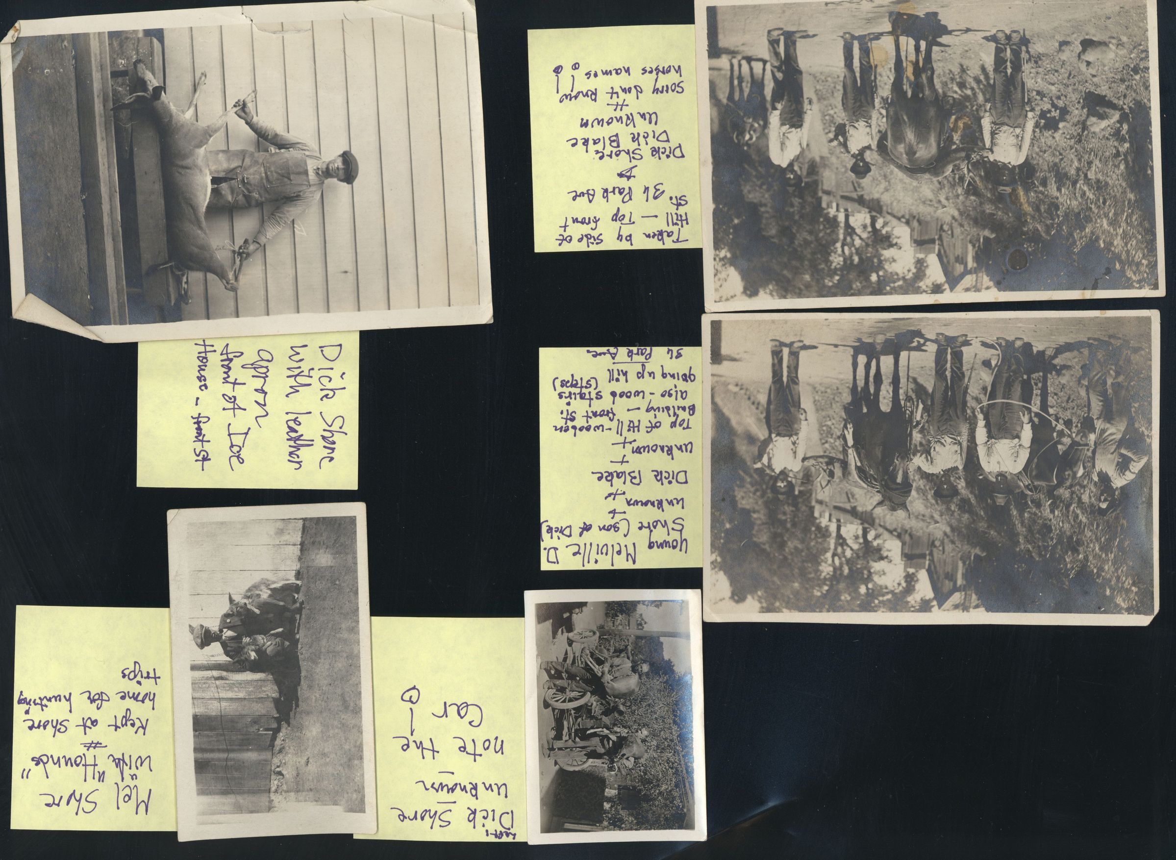 Left photo: Dick Shore with leather apron at Ice House on Front Street showing deer carcass. Top right photo: Mel Shore with "hounds" kept at Shore home for hunting trips. Bottom right photo: Hound kept at Shore home for hunting. SHU029aeCollection