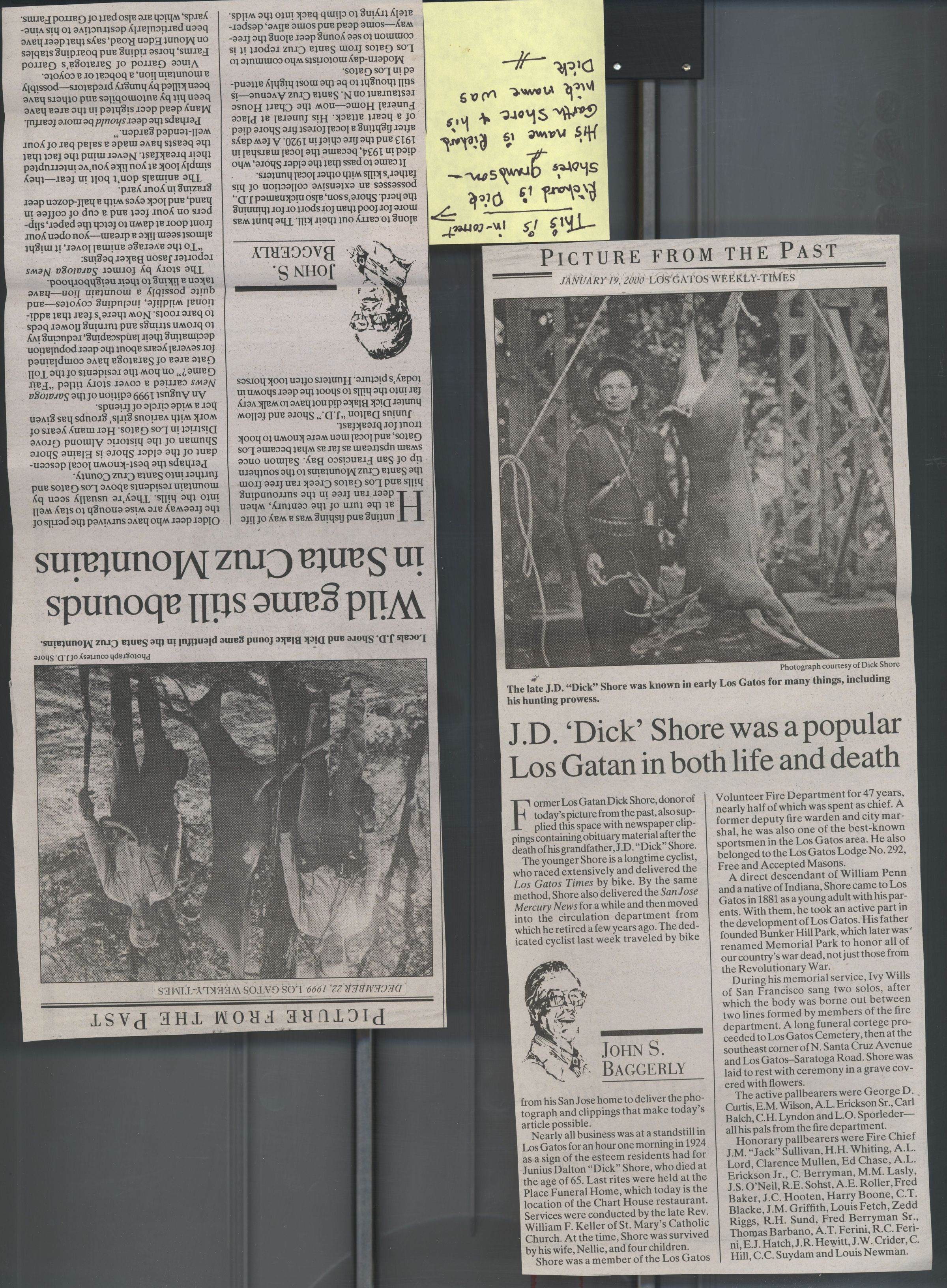 John Baggerly article in Los Gatos Weekly - Times, 12-22-1999 - Elayne Shore Shuman cited a correction that needed to be made to the accompanying article. Richard should be noted as Dick Shore's grandson. His name is Richard Garth Shore and his nick name is Dick. SHU035Collection