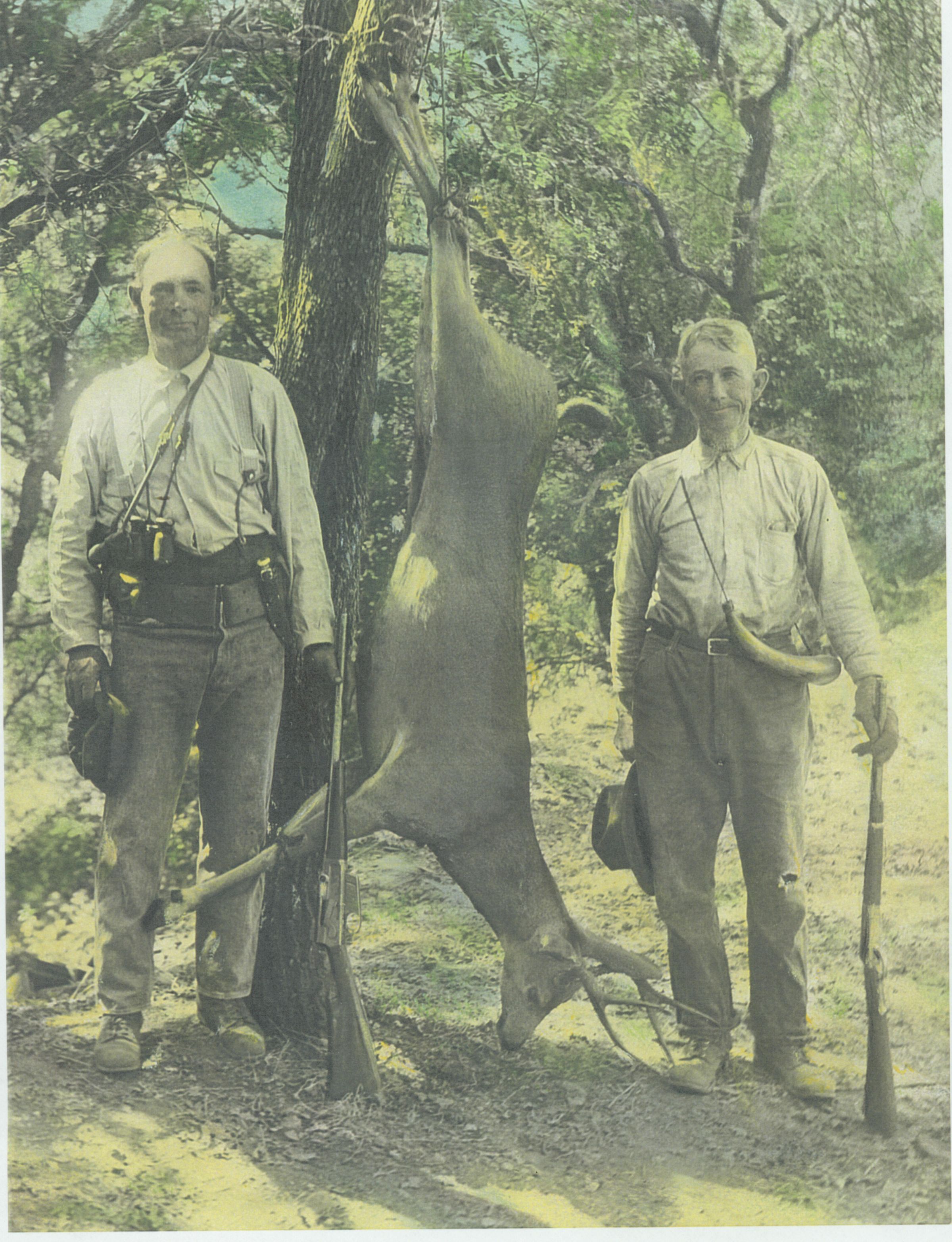 Left photo: J.D. Shore and Dick Blake. Right photo: Group in front of the Union Ice House displaying "trophies." PE084aCollection