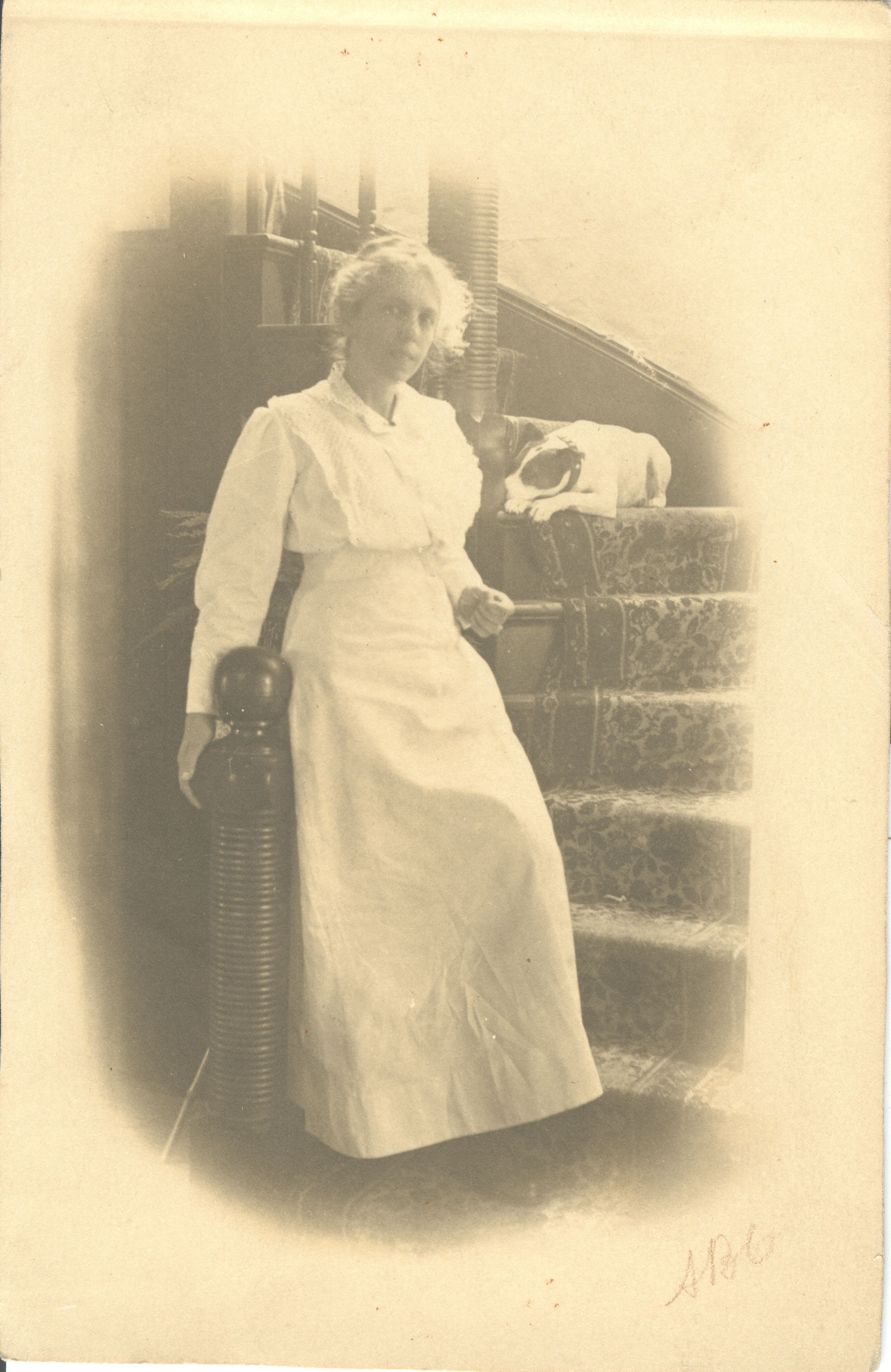 According to the 1900 Federal Census, Genevieve's parents were Francis and Phoeba Hutchins. She was born in 1876. This photograph was probably taken on Wilder Avenue. Genevieve is leaning against the bannister. Her dog, Fleet, is on a stair step. FRA044Collection
