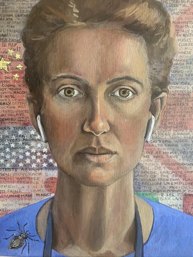 "It is an unfinished oil painting. It is titled ‘I’m listening.’ I painted this self portrait whilst my children studied online. We all sat in the same room and worked. We just stayed at home and listened to what was happening in the world. I will add to the painting as the situation changes. We are expats and my husband has just lost his job so we are going back to the Uk. We have lived here for 2 years."Collection
