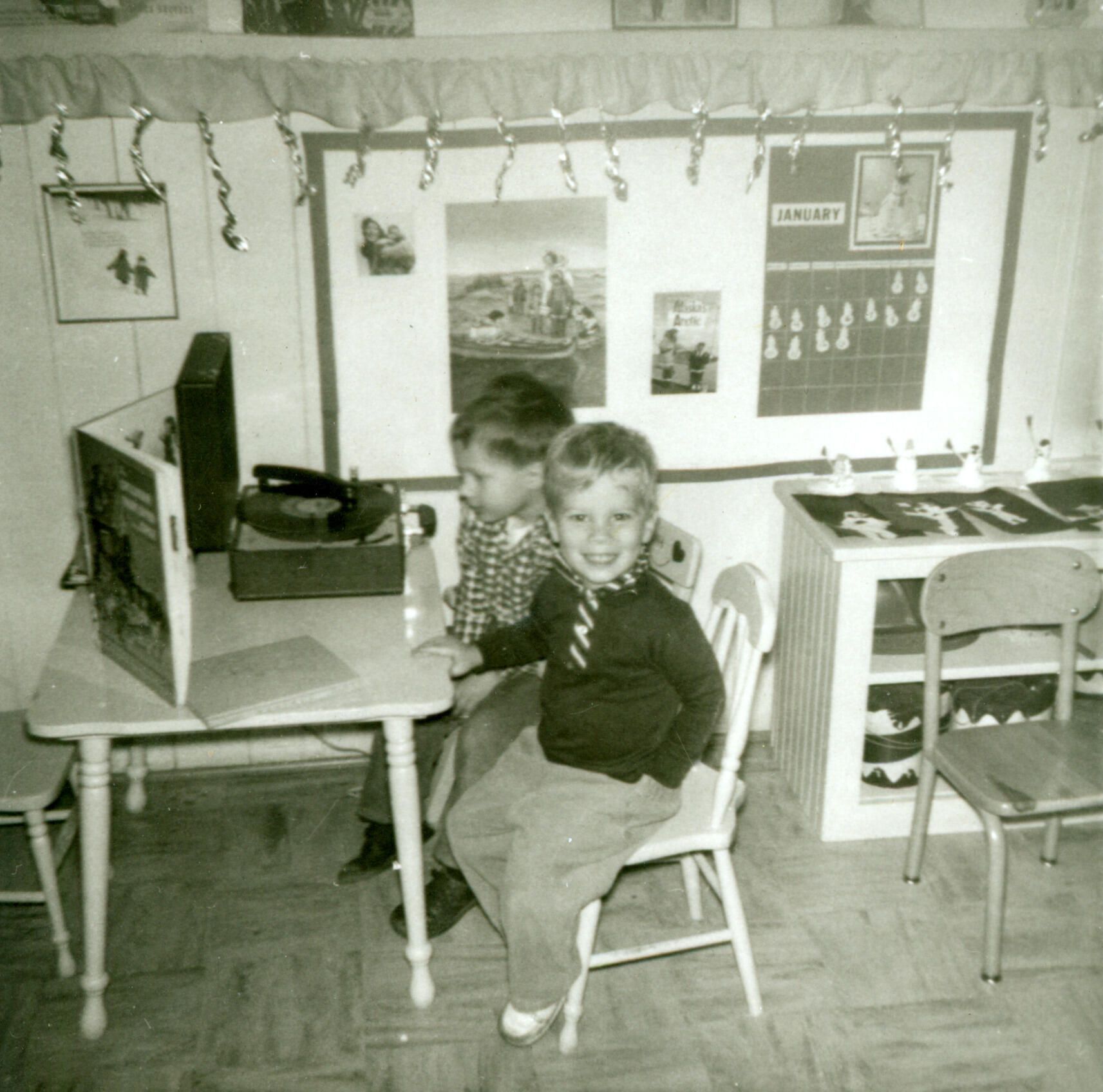 Dana Linscott and Johnny Sutton are shown listening to a record. HIL001Collection