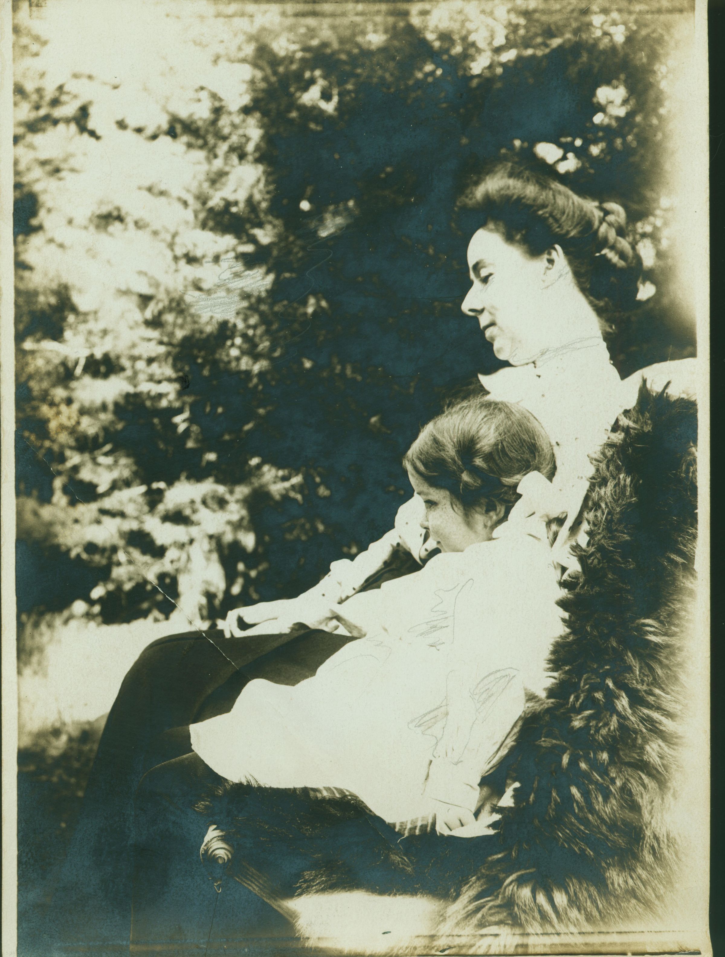 This photograph, purchased as part of a large collection of Tobin images and memorabilia by Charles Bergtold, is probably Isabella Kirkpatrick Tobin (1838-1917) with her middle daughter, Mary Isabella Tobin, in about 1880. Isabella was born in London, England, but her parents were natives of Scotland. The Kirkpatrick family immigrated to the United States in 1843 aboard the ship "Huntress," arriving on Dec. 23 that year. Isabella was 5 years old, and her sister Janet was 9 years old. Their father, John Kirkpatrick, was 40 years old and listed as a merchant. Isabella was the bride of Lieutenant John F. Tobin by the time she came to California via the Isthmus of Panama. The couple left Cannelton, Indiana at the close of the Civil War and settled in Santa Clara for about ten years. The Tobin family then moved to Los Gatos and opened the town's first news depot in part of their house on East Main Street. Isabella remained in Los Gatos for the rest of her life, about 35 years. When she died on December 6, 1917, at the age of 79, she left an estate valued at $10,000. TOB016Collection