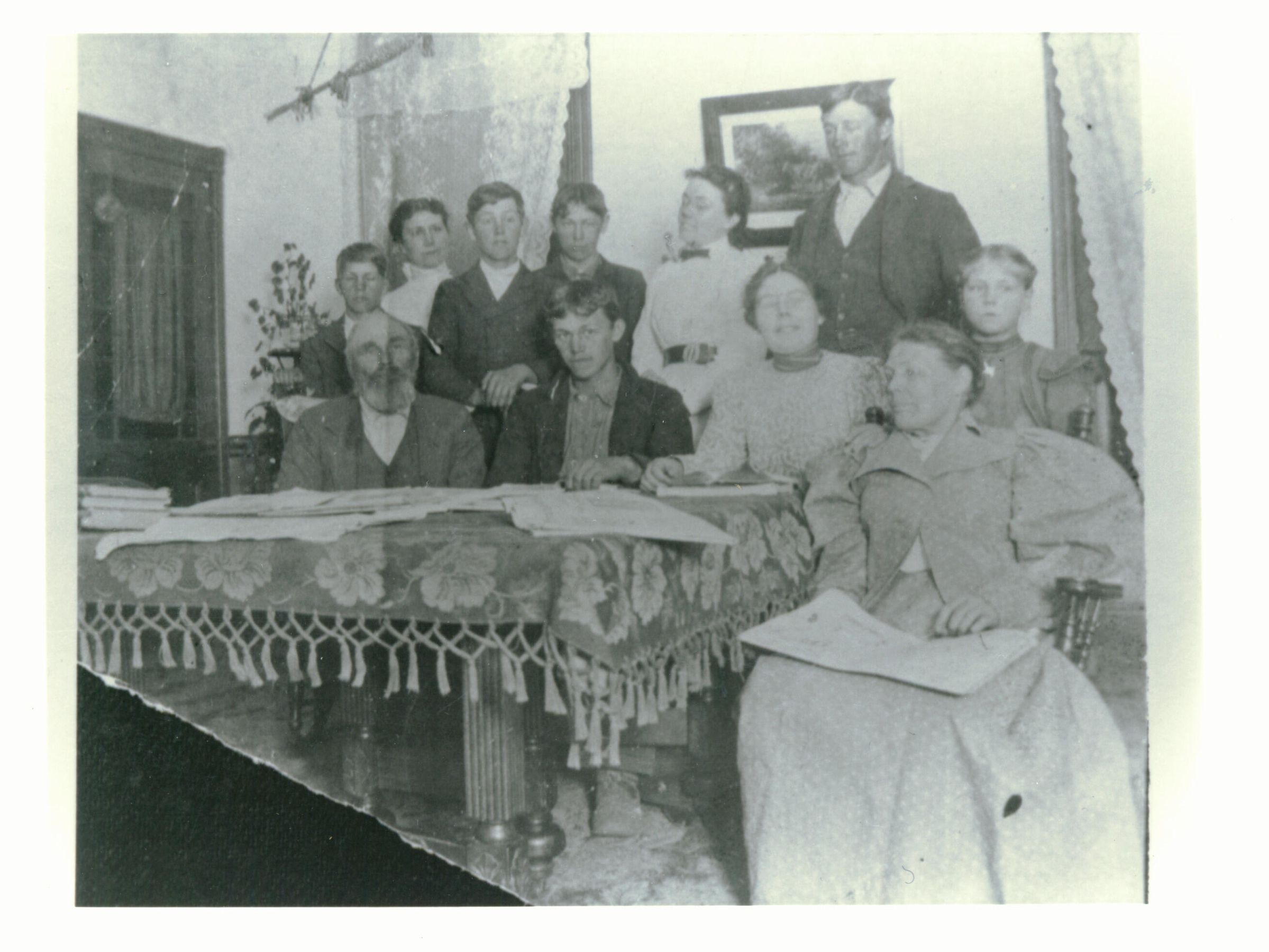 This is a rare interior photograph of a pioneer family gathered around the dinner table, circa 1900. John and Ann Jane Cilker are shown with their 9 children at the family ranch. CLK015