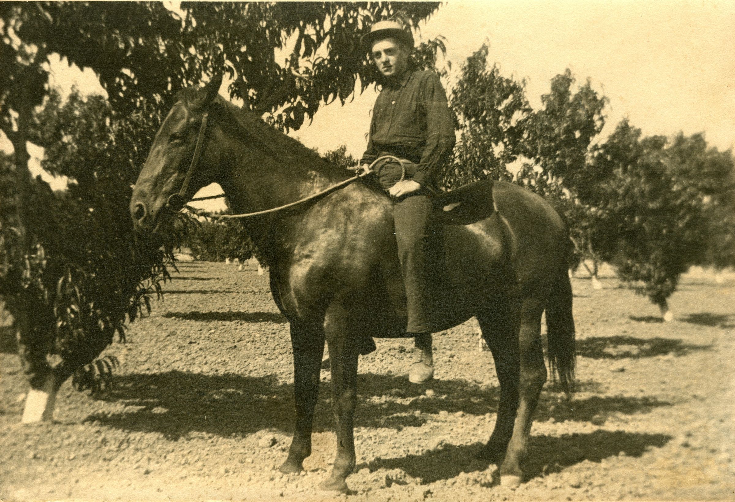 Joseph Scott is shown riding his horse at the Scott Ranch on National Ave. The ranch grew mostly peaches, although later the Scotts planted prune trees. FIN019Collection