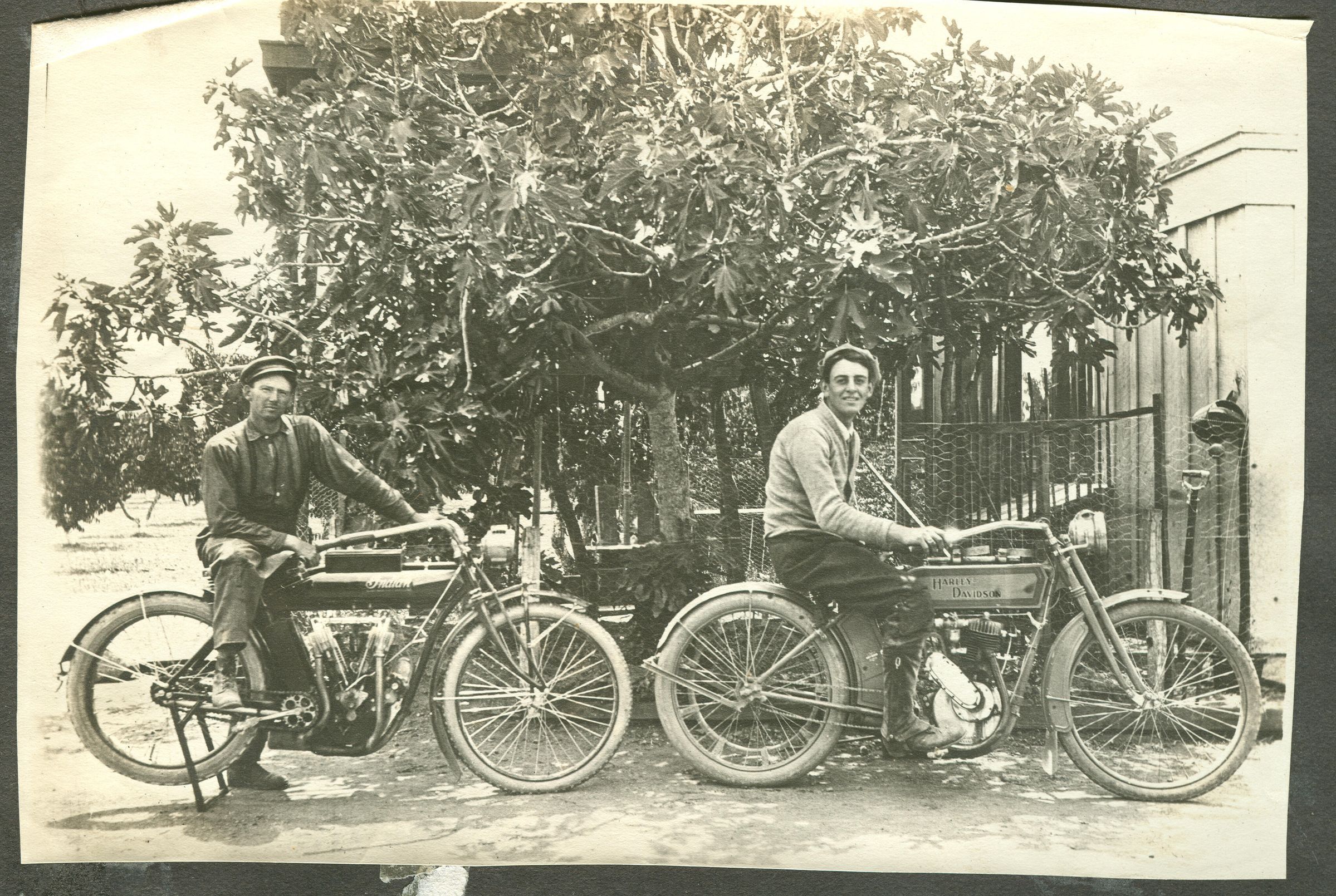 Joesph Scott (1894-1966) is shown on the right on his Harley Davidson motorcycle, and his friend Emery Main (1883-1955) has an Indian motorcycle at left. They posed in front of the packing sheds on the Scott ranch on National Avenue, circa 1912. Time for riding came only after the farm work was done. FIN057Collection