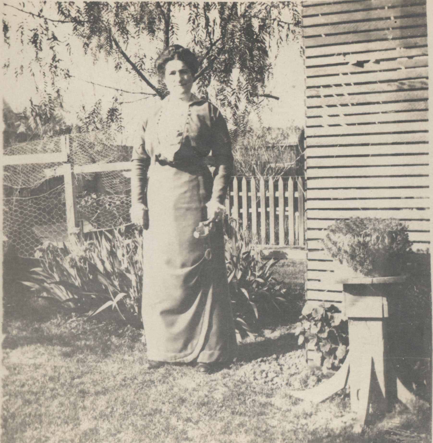 Susie M. Walker Kyle (1875 - 1951) and her husband William J. Kyle moved into their new Victorian home at 127 North Santa Cruz Avenue in 1906. Susie was a superb gardener, and some of her rare specimens have been propagated through the years and still exist. She is pictured here in her garden. SHU042Collection