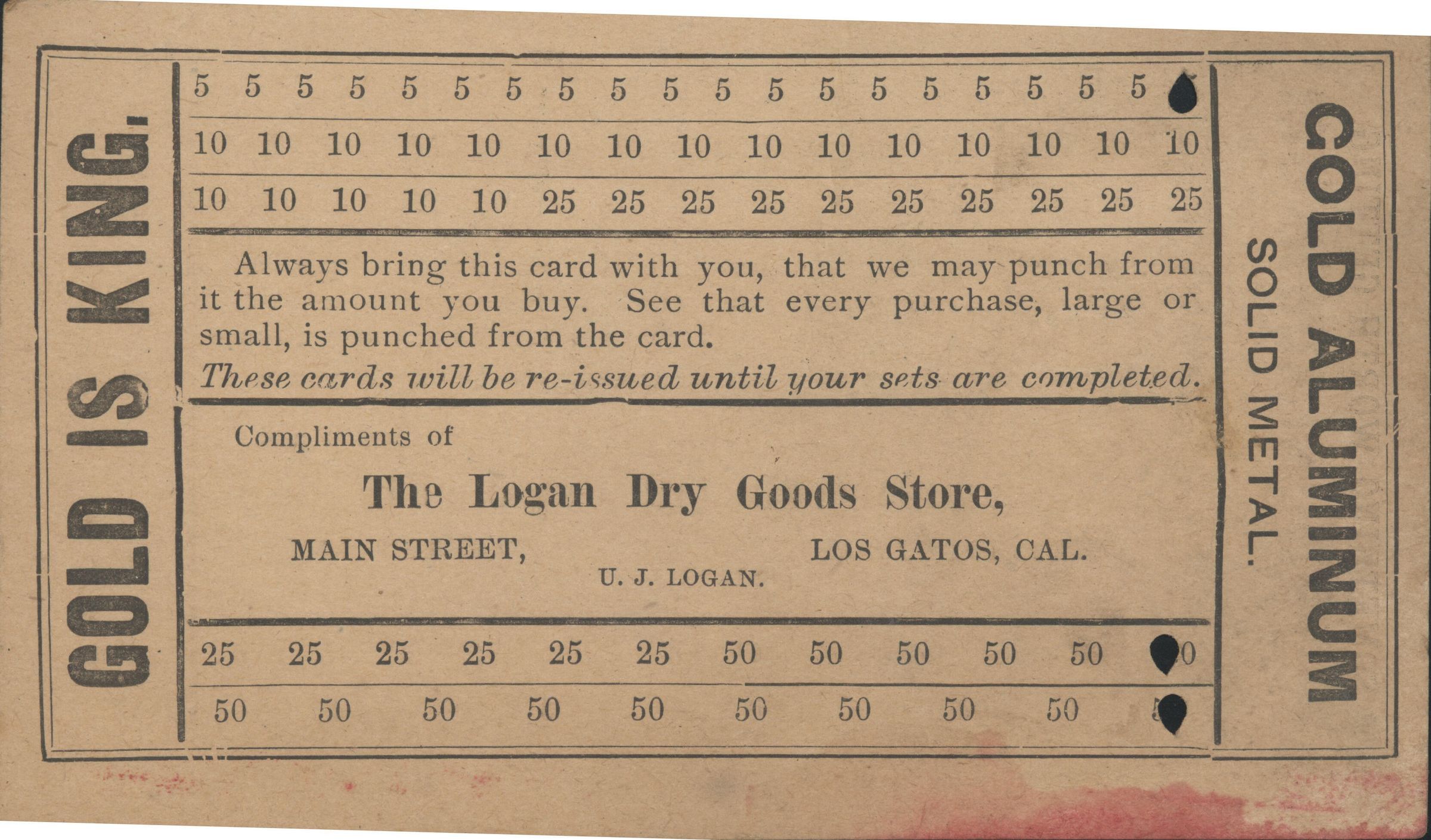 Logan's Dry Goods on Main Street issued these cards for recording accumulated purchases. "Gold is King" is printed on the card. BER102Collection