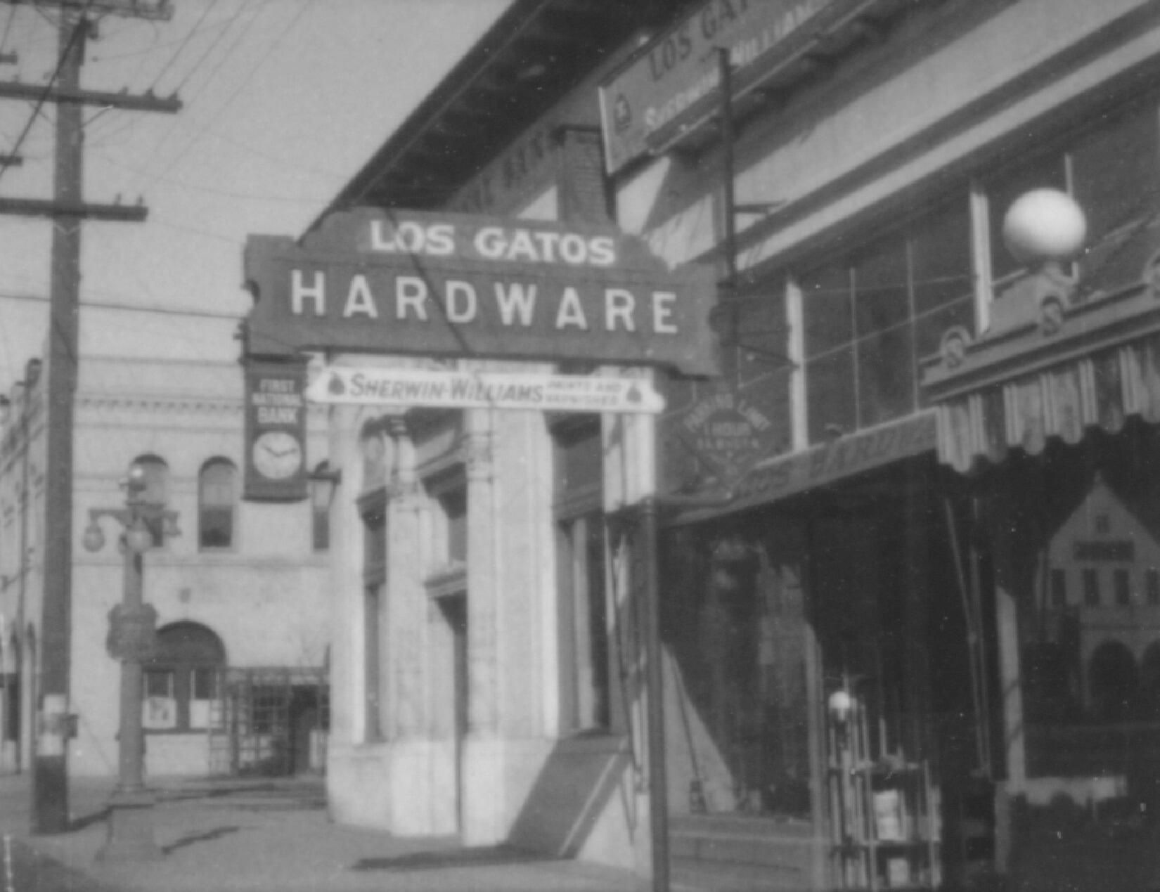 Los Gatos Hardware Company at 110 W. Main St. The building next door with the clock is the First National Bank at 112 W. Main. Across the railroad tracks is the Bank of Italy at 122-26 W. Main St.Collection